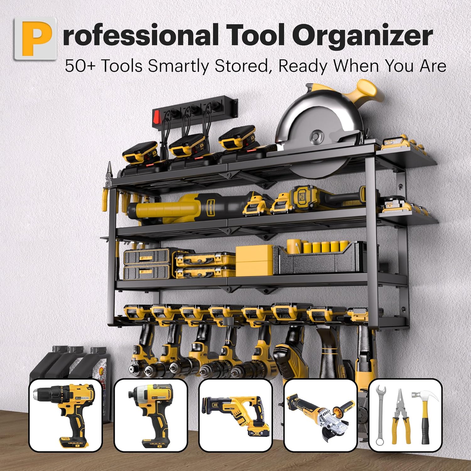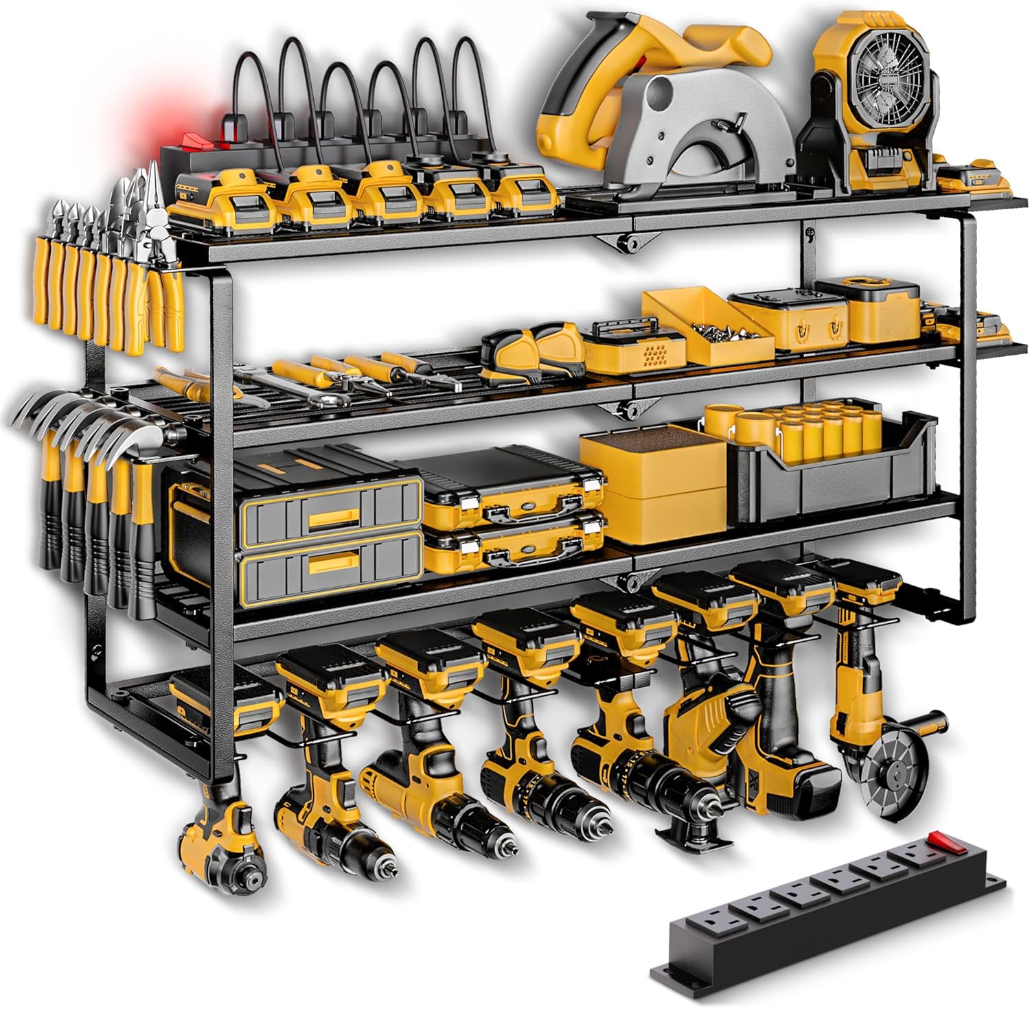 - Easy Charging: A power tool organizer with a charging station, very convenient for charging your tool batteries. It keeps rechargeable tools organized in the work area and saves your bench space. A 5ft 14AWG power cord is included