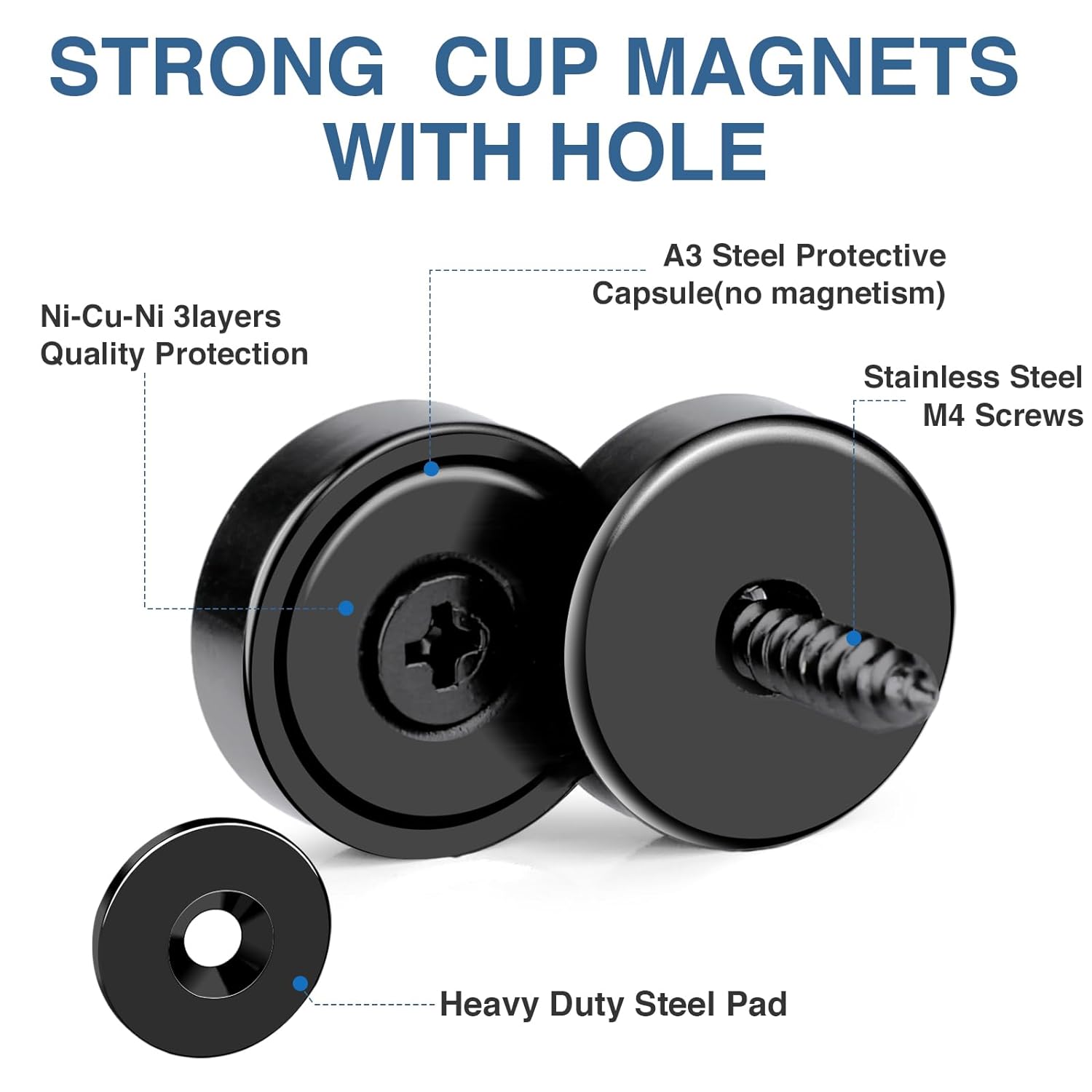 - 【UNMATCHED DURABILITY】These countersunk magnets with hole are made of NdFeB material with a nickel-plated coat for maximum durability and protection against corrosion. Steel cups protects magnets from breaking which greatly increase the longevity of the rare earth cup magnets.