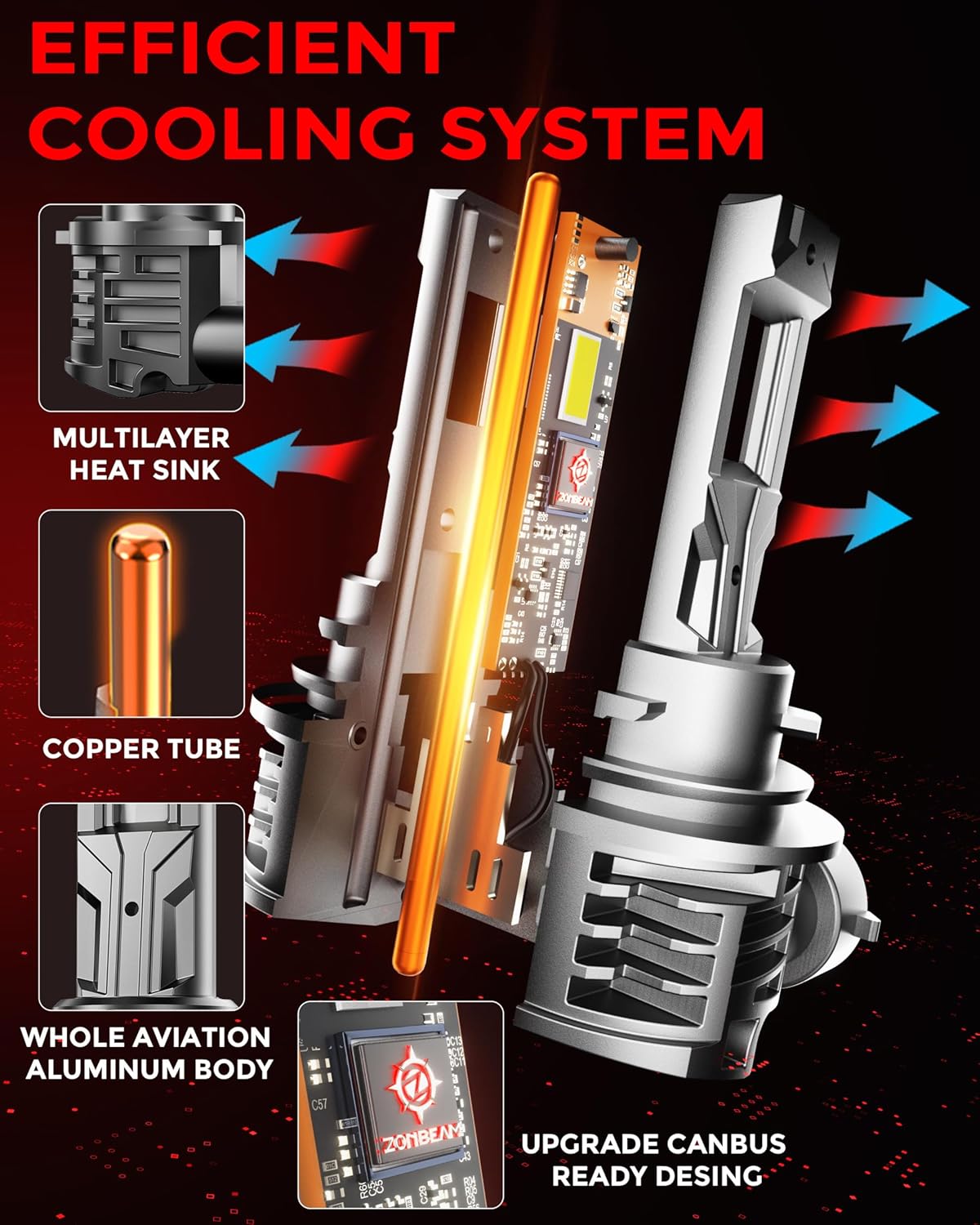 - [60,000 Hour Long Life] Military-grade aircraft aluminum, multi-layer heat sinks and liquid-cooled copper tubing enhance the heat dissipation of the bulb. High-performance matrix chip resists light decay and saves energy. Over 60,000 hours of service life, 200 times longer than halogen lamps. Eliminates the need for frequent replacement.