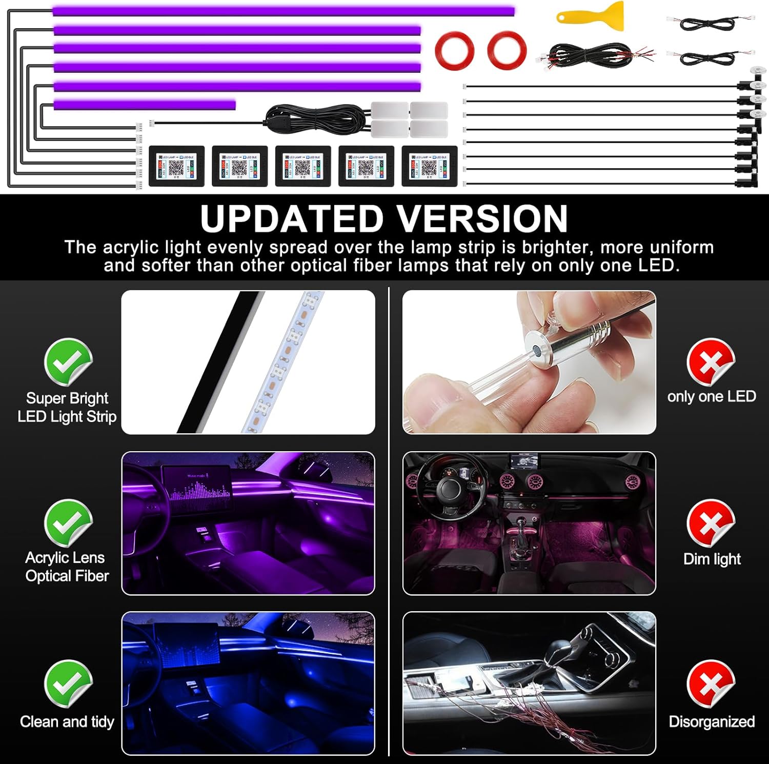 - ăHigh Bright & UniformăThe Acrylic Car Ambient Interior Lighting have super bright LED and acrylic lens and contains 6 LED strips (4*29.5inch+1*43.3inch+1*14inch), Foot well lamp*4(44.5inch*2/64.9inch*2) and Door handle light*4+doors storage box light*4 (21.6+21.6inch), also comes with 1 main controller and 4 sub controllers,and can be flexibly installed on any car by DIY without disorganized, which is plug and play, and this acrylic light evenly spread over the lamp strip is brighter, more uniform and softer than other optical fiber lamps that rely on only one LED.