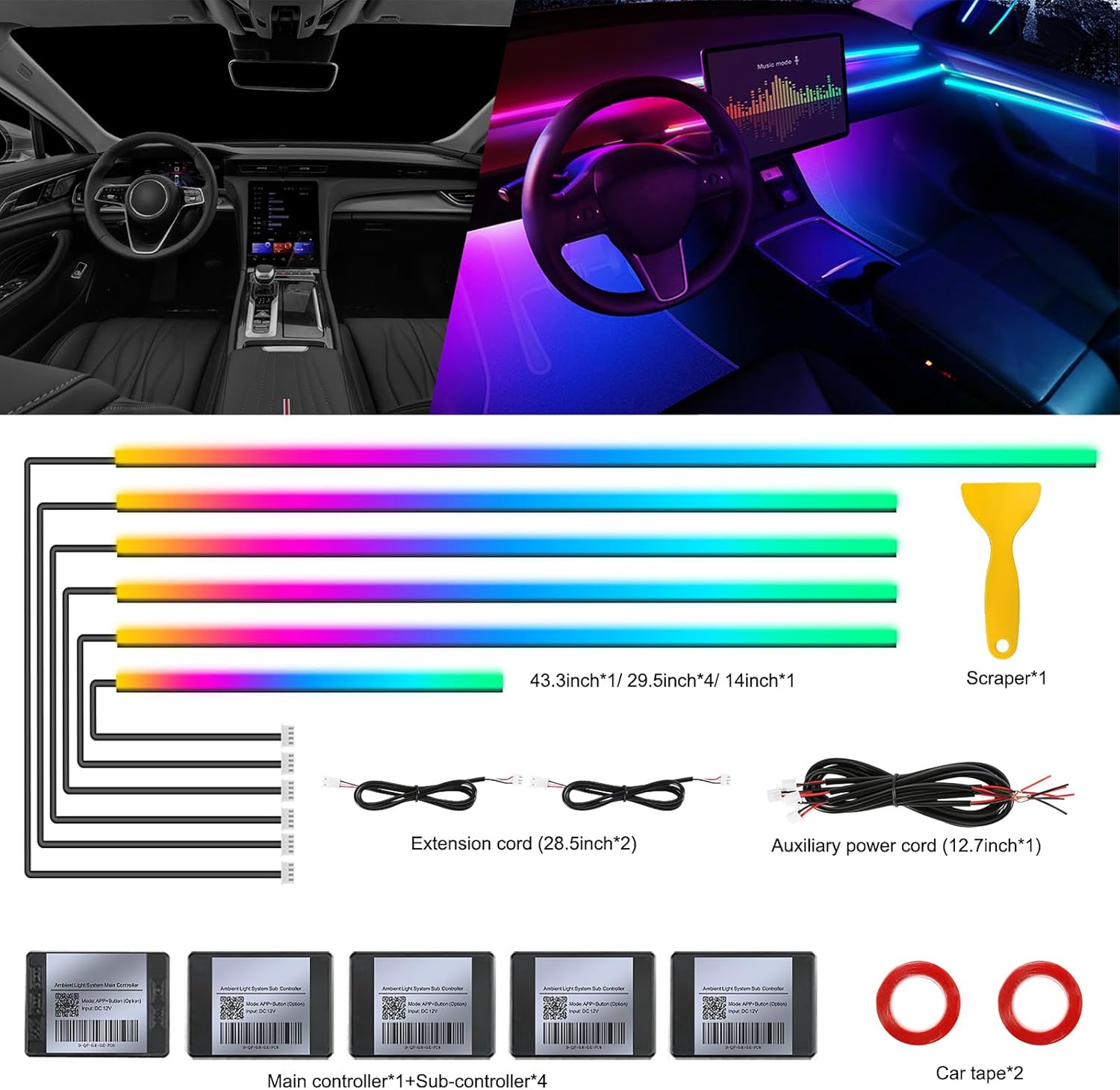 - Included Components : 2*Adhesive tape, 6 in 1 Acrylic car light kit(4*29.5inch+1*43.3inch+1*14inch), Control box* 5, Pry tool*1+ 2*Adhesive tape, 6 in 1 Acrylic car light kit(4*29.5inch+1*43.3inch+1*14inch), Control box* 5, Pry tool*1+