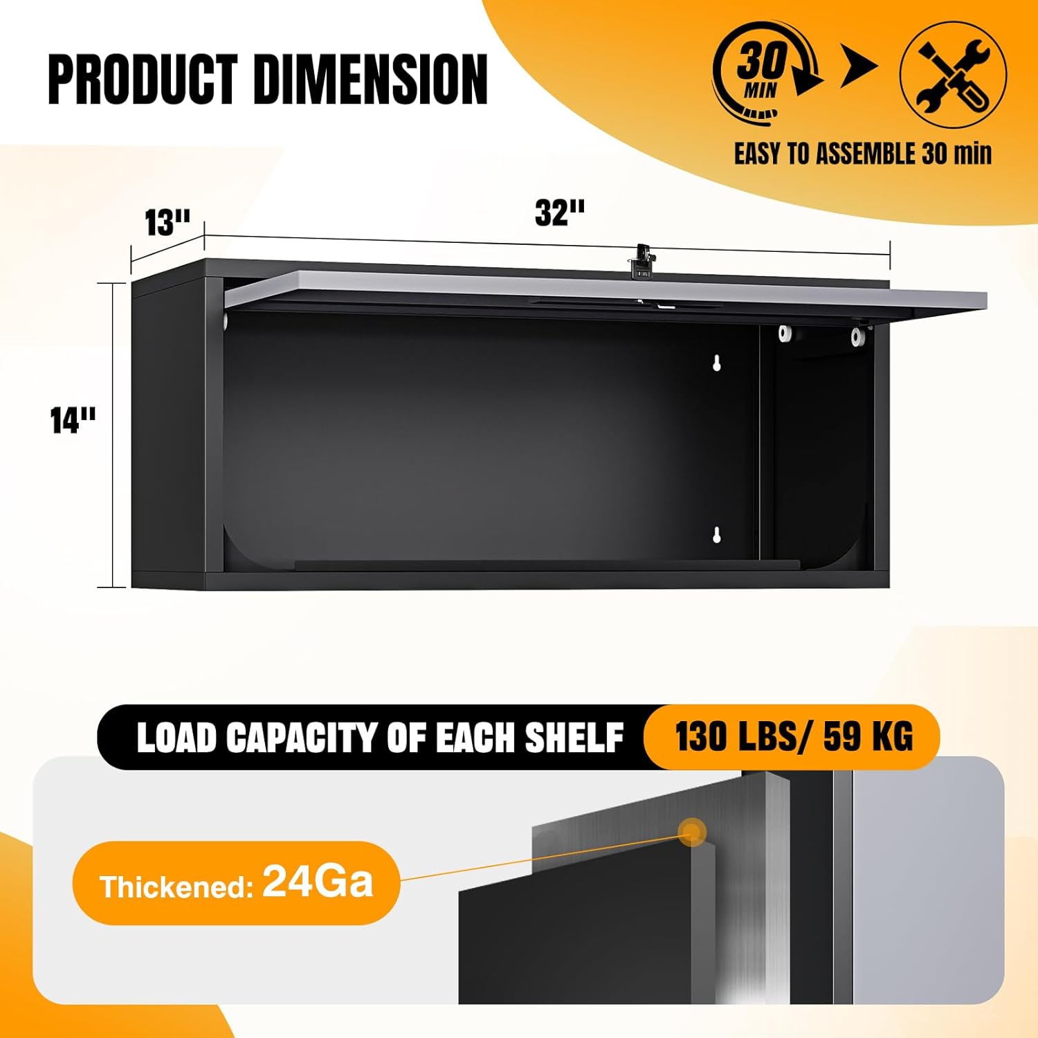 - â â€ăHigh quality wall cabinetă:The Floating Metal Garage Cabinet is made of pressed sheet metal 0.65 mm SPCC steel plate. It is sturdy, and the steel is powder coated, which helps prevent rust. The robust steel construction can support up to 130 lbs for each shelf.