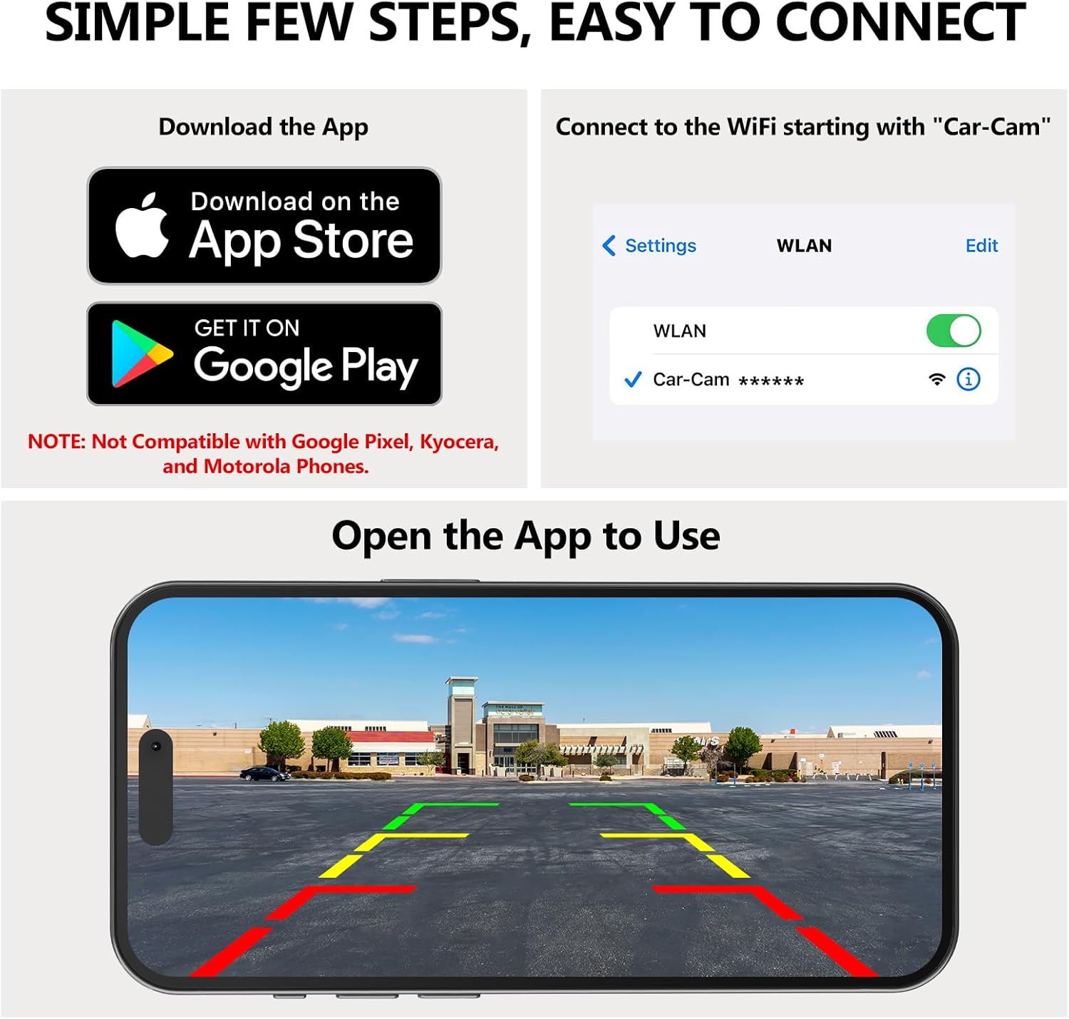 - ăEasy 1Min InstallationăSay goodbye to complex setups! Our wifi backup camera offers effortless installation in just 3 simple steps: download the app, connect to WiFi, and view the image on your phone or tablet. No drilling, no wiring required. (NOTE: Not compatible with Google Pixel, Kyocera, and Motorola phones)
