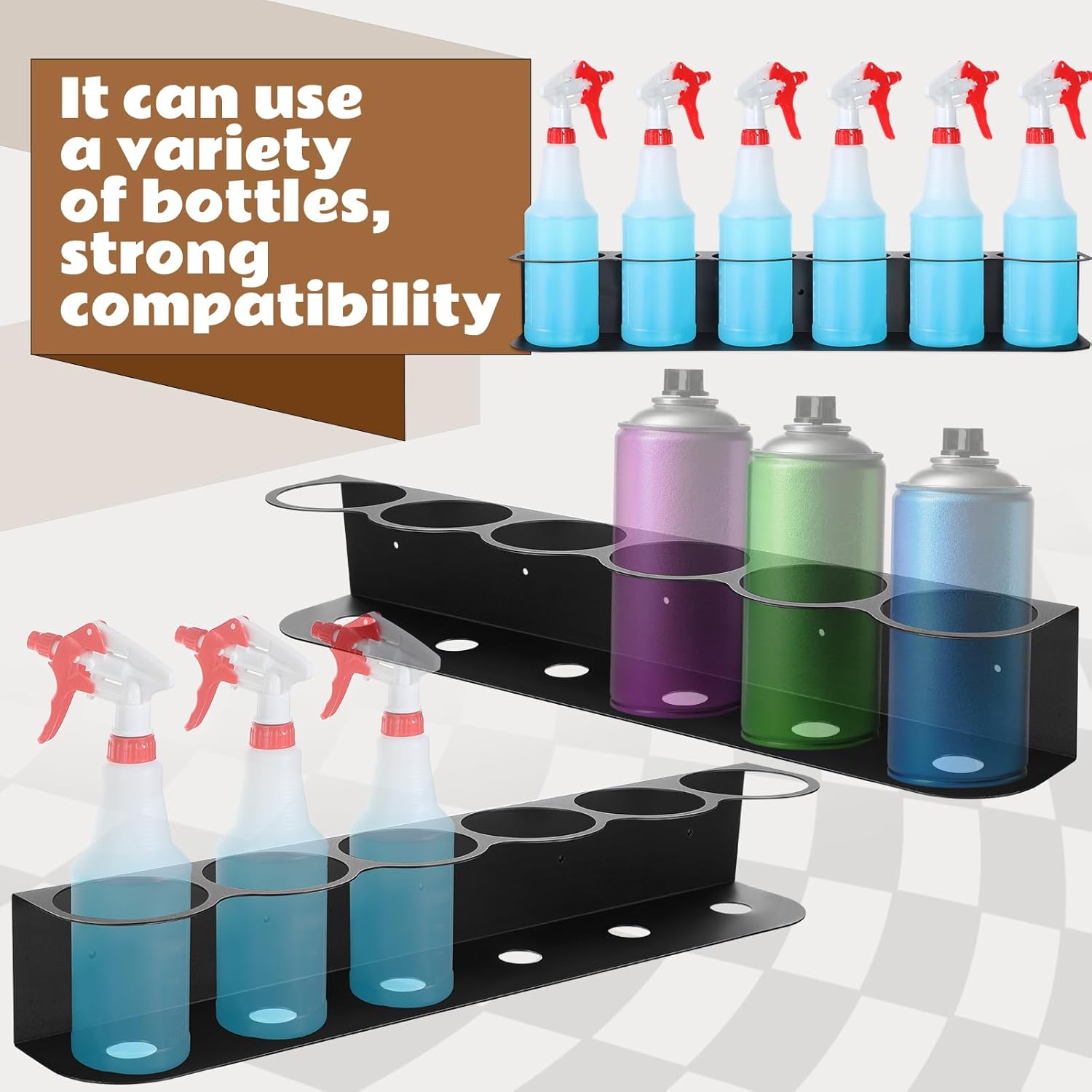 - Convenient Package: the package includes 2 spray bottle racks, giving customers the option to store up to 8 bottles at once; With additional holders, you can organize your workspace even more efficiently, and always have your cleaning supplies within easy reach