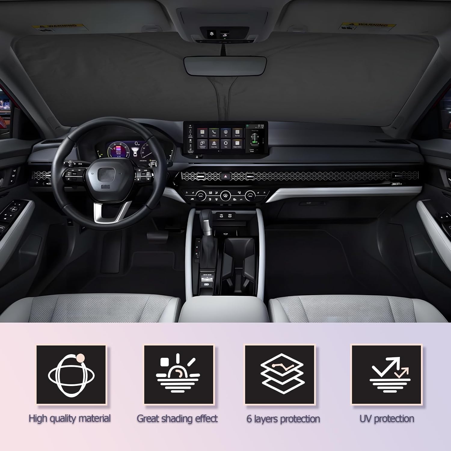 - 【High-quality Materials】This fit for 2024 Honda Accord LX, EX, Sport, EX-L, Sport-L and Touring windshield sun shade is made of premium 240T material, multilayer design. Not only block and reflect heat, but also blocks out harmful UV rays and sunlight. The two reinforced steel bezels also provide better durability and can be folded indefinitely, ensuring a longer and safer lifespan