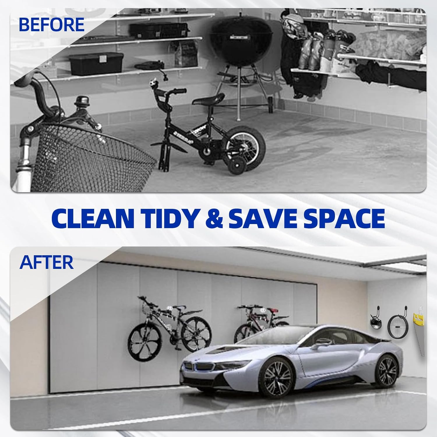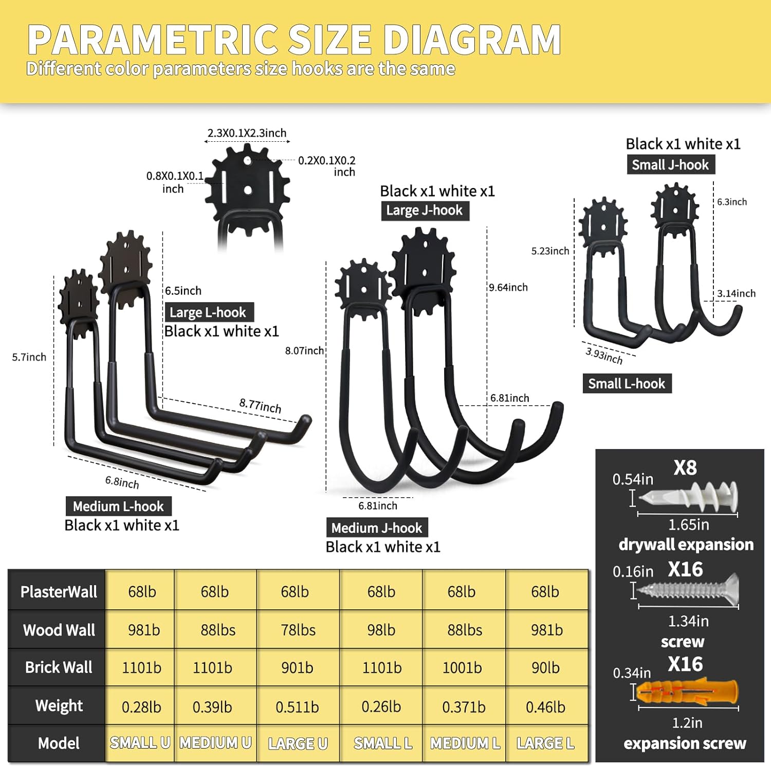 - The Tool Include - There are 10 Black defferent size and 20 screws and anchors. There are multiple sizes of garage hangers to fit all of your needs ranging from items as big as bicycles to the smaller ones like extension cords.
