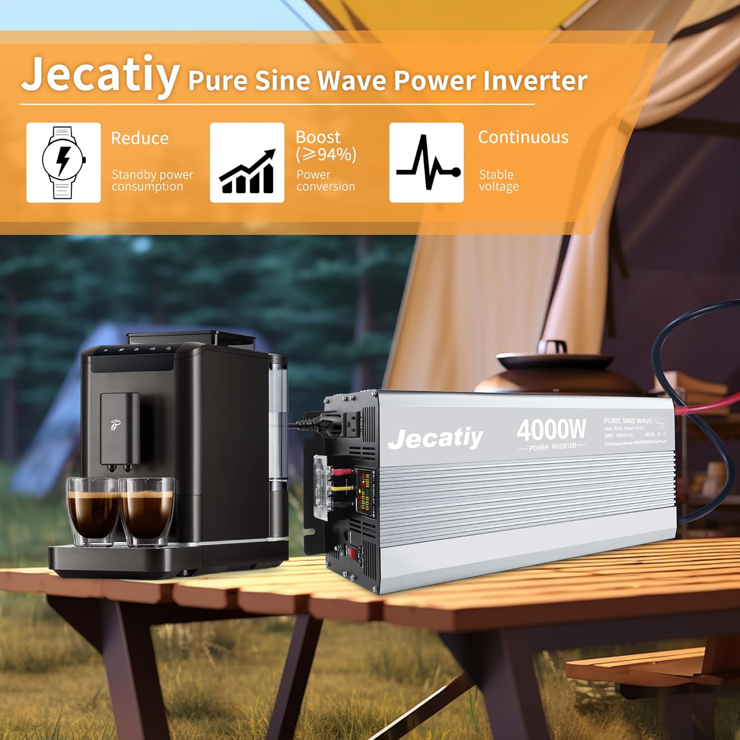 - 【4000W 24V Pure Sine Wave Inverter】Jecatiy upgrade fully 4000 Watt Power Inverter converts 24V DC to 110V/120V AC with 2 AC Charger outlets, 5V 500mA USB Charging Ports .The power inverter output efficiency can be up to 94%. The maximum peak value of a pure sine wave inverter is 8000W. Note: The voltage of 110V is the actual display, and 100-120V is the supported range of the application