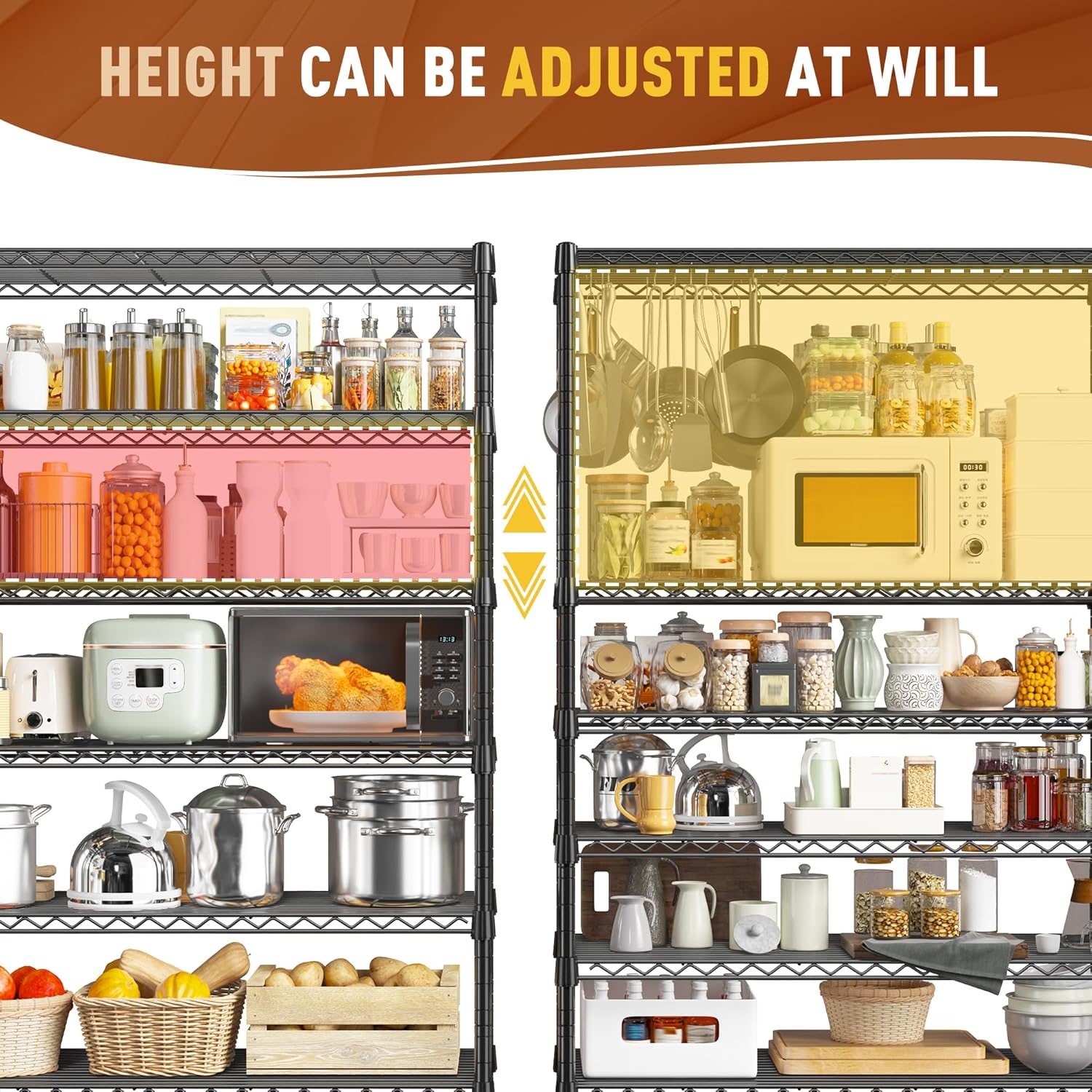 - ăHeight adjustable & Split into 2 Shelves & DIY Free Combinationă The shelving heights are all 100% customizable. You can put the wire shelving board at any height you want from the floor to the top of the shelf poles. Metal storage shelves can be split into 2 Shelves as workforce as you need. If you wanna be an organized expert, try this wire shelving rack