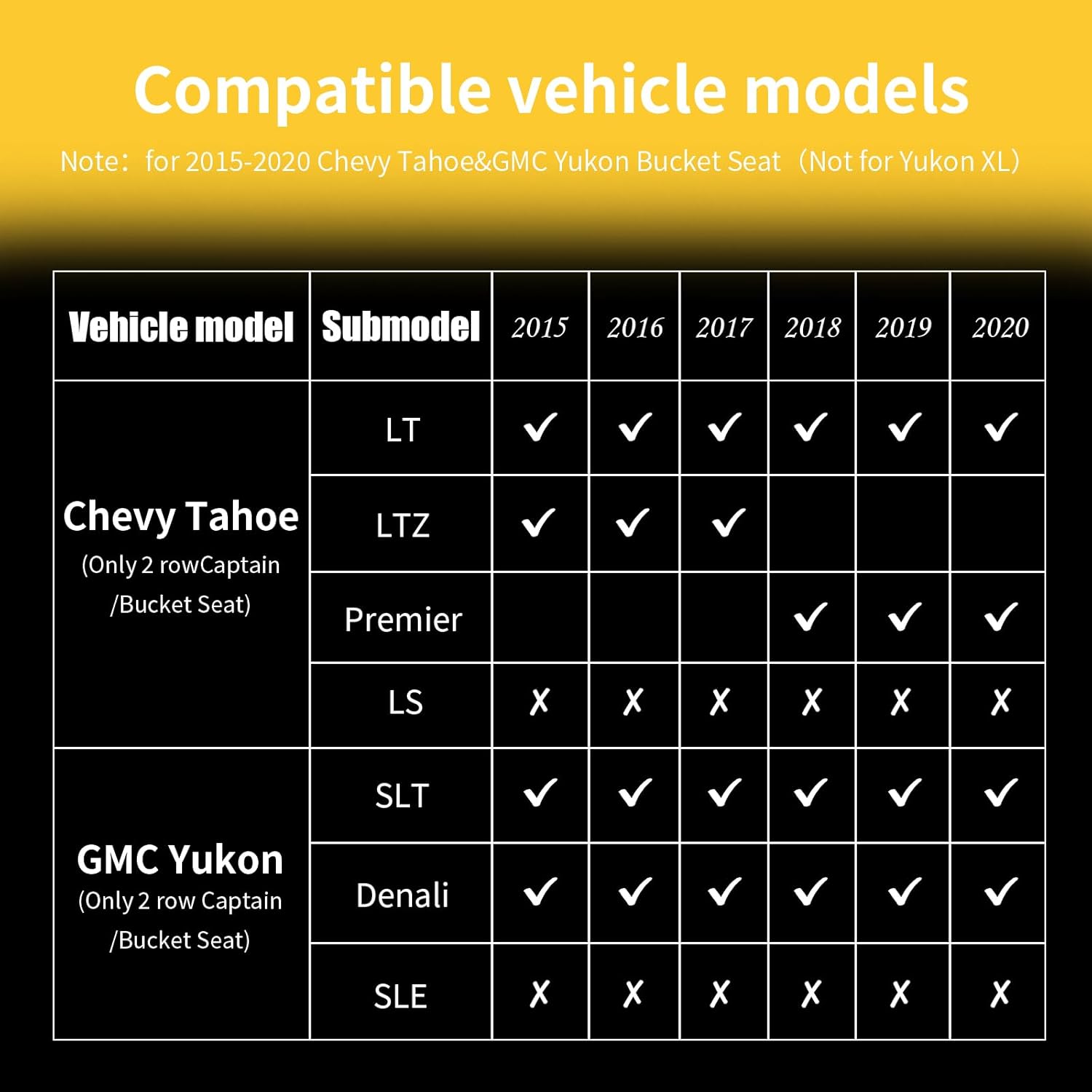- Custom fit:Fit for Chevy Tahoe 2015-2020 with 2nd Row Bucket Seats, Fit for GMC Yukon with 2nd Row Bucket Seats