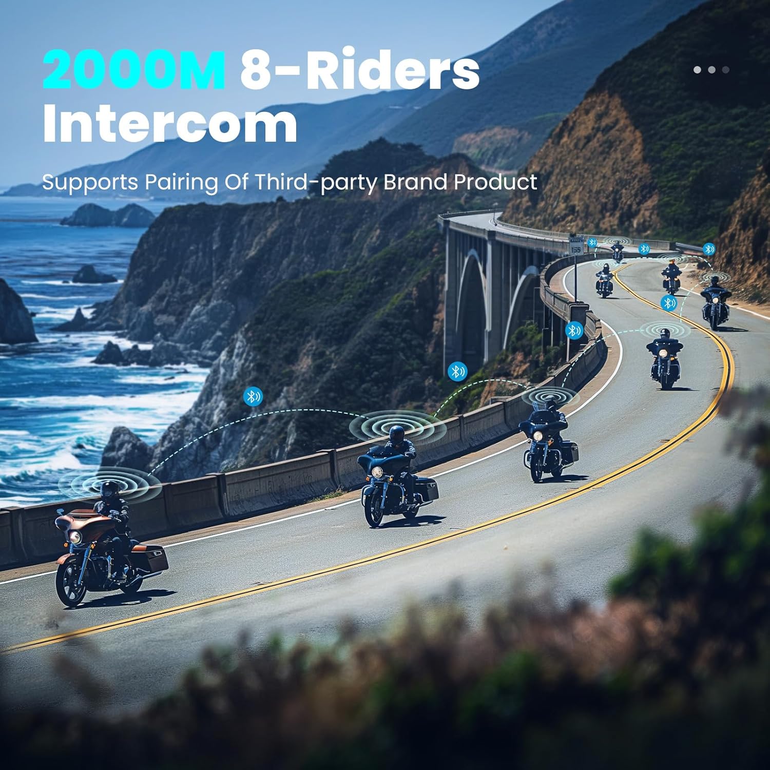 - Shark-Like Appearance & Interchangeable Color Strips : This motorcycle communication system features a streamlined biomimetic shark design that is windproof, noise-reducing, and incredibly cool. It comes with interchangeable three-color stripes, allowing you to customize the look, ensuring it matches any helmet type or color. It is the perfect choice for couples, lovers, and families who want to ride motorcycles together!