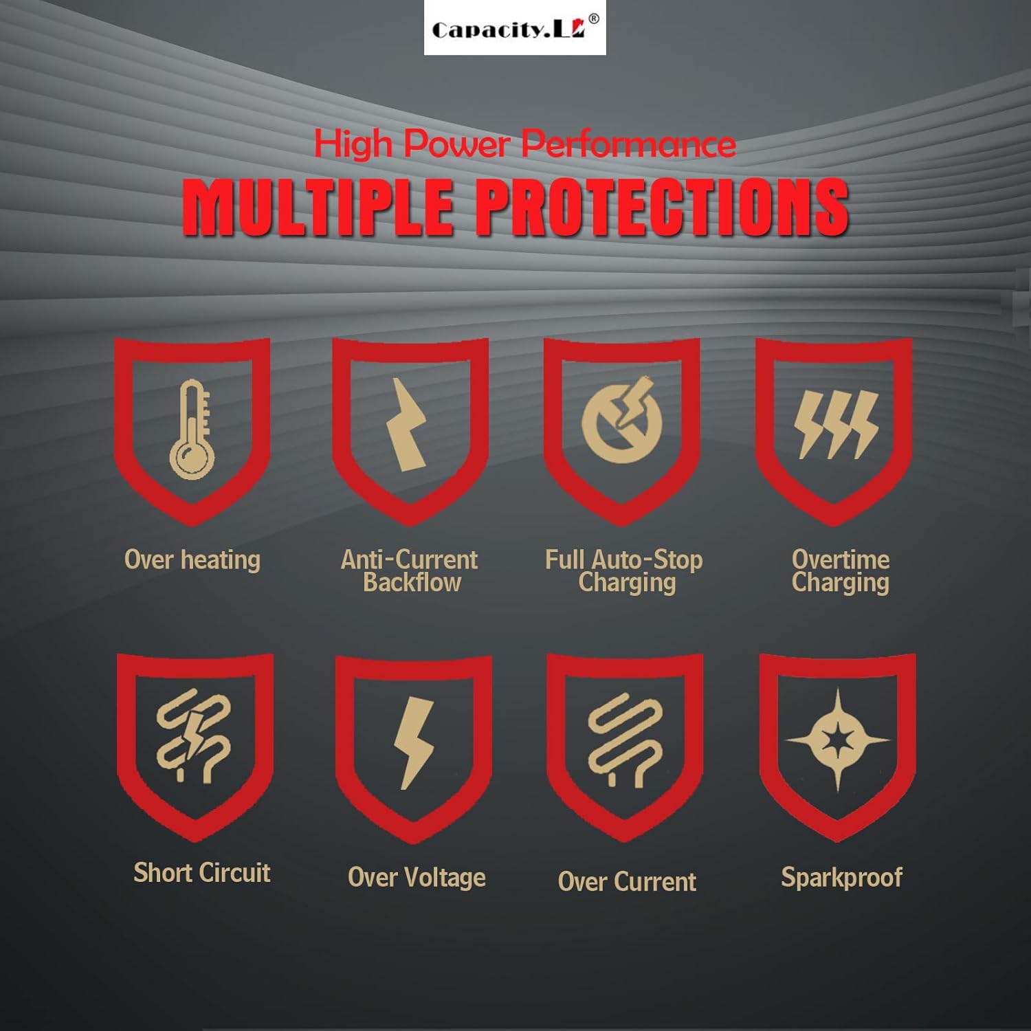 - MULTIPLE PROTECTIONS--Capacity. Li high power LiFePO4 lithium batteries charger adopt ABS flame-retardant shell, fireproof, anti-shock, corrosion resistance, sturdy and durable, built in circuit protection, spark free system, reverse polarity protection, over-charge, over-voltage and over-temperature protection. The intelligent LCD display shows the charging status and battery status, so that you can charge more at ease. Please read the instructions carefully before proceeding.