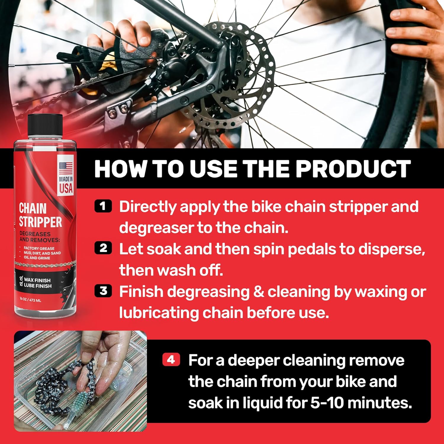 - Powerful & Easy To Use: Bike Chain Degreaser + Stripper can be applied directly to the chain, let soak and then spin pedals to disperse, then wash off. For a deeper cleaning remove the chain from your bike and soak in liquid for 5-10 minutes. Can soak and clean up to 5 chains with 6oz of degreaser