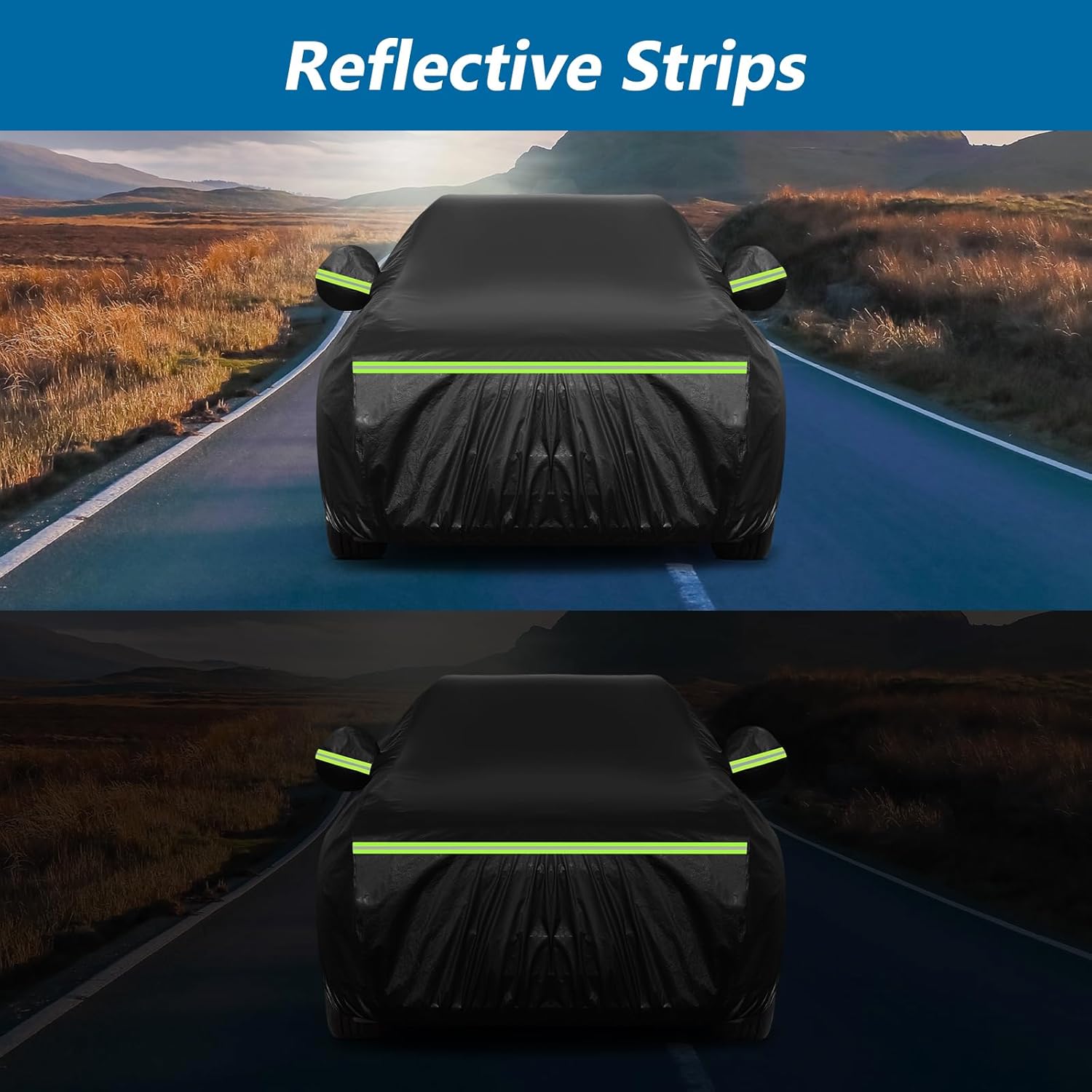 - ăReflective Strips and Driver-Side Zipper Designsă(1) Black Coating: UV protection and heat-proof, prevent cracking and aging of inner decoration leather and plastic. (2)5 Reflective Strips attached on the front DRL lamps, middle Turning lights, and Rear taillight to prevent collisions during the night. (3)It has four straps, a windproof buckle, and a storage bag. (4)Mirror Pocket: protect the rearview mirror in all directions. (5) A zipper on the cab side for convenience.