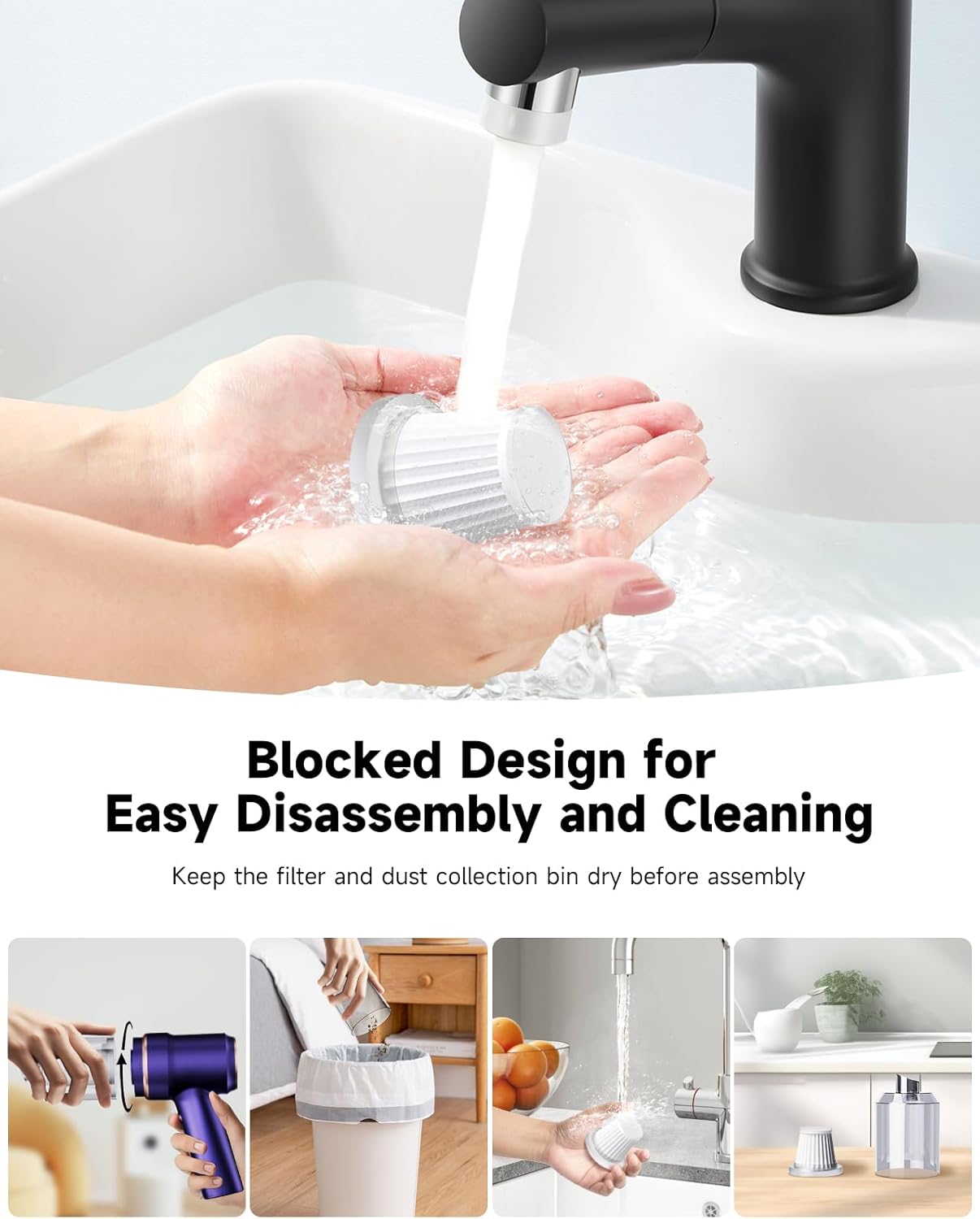 - ăAdvanced HEPA Filtration & Easy MaintenanceăThis handheld vacuum uses an efficient, washable HEPA filter trapping 99% dust/allergens. Keeps air cleaner & protects motor, extending life. As a small vacuum cleaner, its user-friendly design means dust cup and HEPA filter detach easily for simple rinsing. Ensure parts are fully dry before re-installing to maintain peak suction & filtration. Easy upkeep for lasting power.