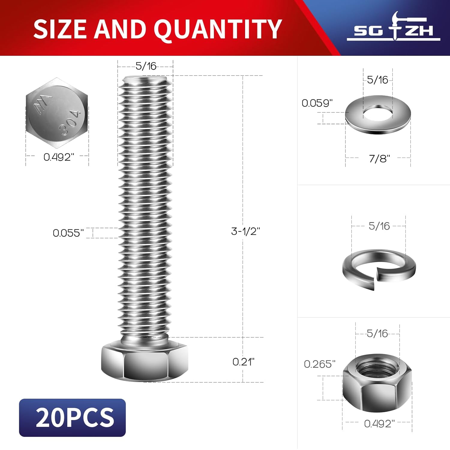 5/16-18 x 3-1/2" Hex Head Screw Bolt, Nuts, Flat & Lock Washers, 20Pcs 18-8 (304) Stainless Steel, Fully Threaded, by SG TZH