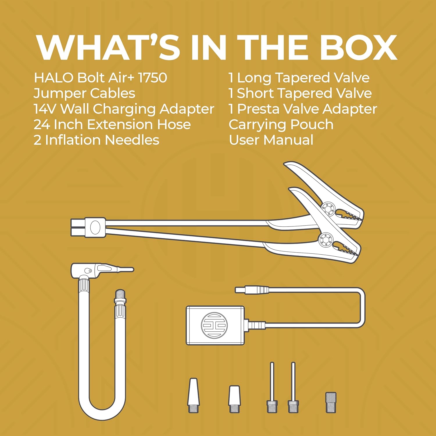 - HALO Bolt Air+ 1750: No more dead car batteries or flat tires. Jump start your vehicle, inflate your tires, and charge USB powered devices. It has an integrated floodlight, so you’re better prepared for roadside emergencies and power outages