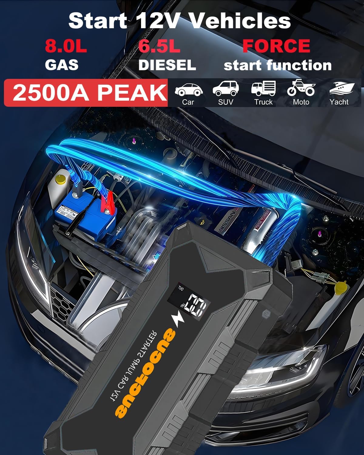 - ăMore Powerful Jump StarterăSUCFOCUS jump starter battery pack can quickly jump start a dead car battery. Even if the battery voltage is too low, pressing the "RST" button ( Top right corner on back of the connector) will force the car to restart. With boosted 2500A peak current, the SUCFOCUS car battery jump starter can restart your 12V vehicles (Up to 8.0L gas/6.5L diesel engines) in seconds with a 45 C high-rate lithium battery. Suitable for cars, trucks, motorcycles, SUV, ATV, UTV, dirt bike, snowmobile, boats, lawnmowers, trailer, RV, tractor and so on. Up to 20 jump starts on a single charge.