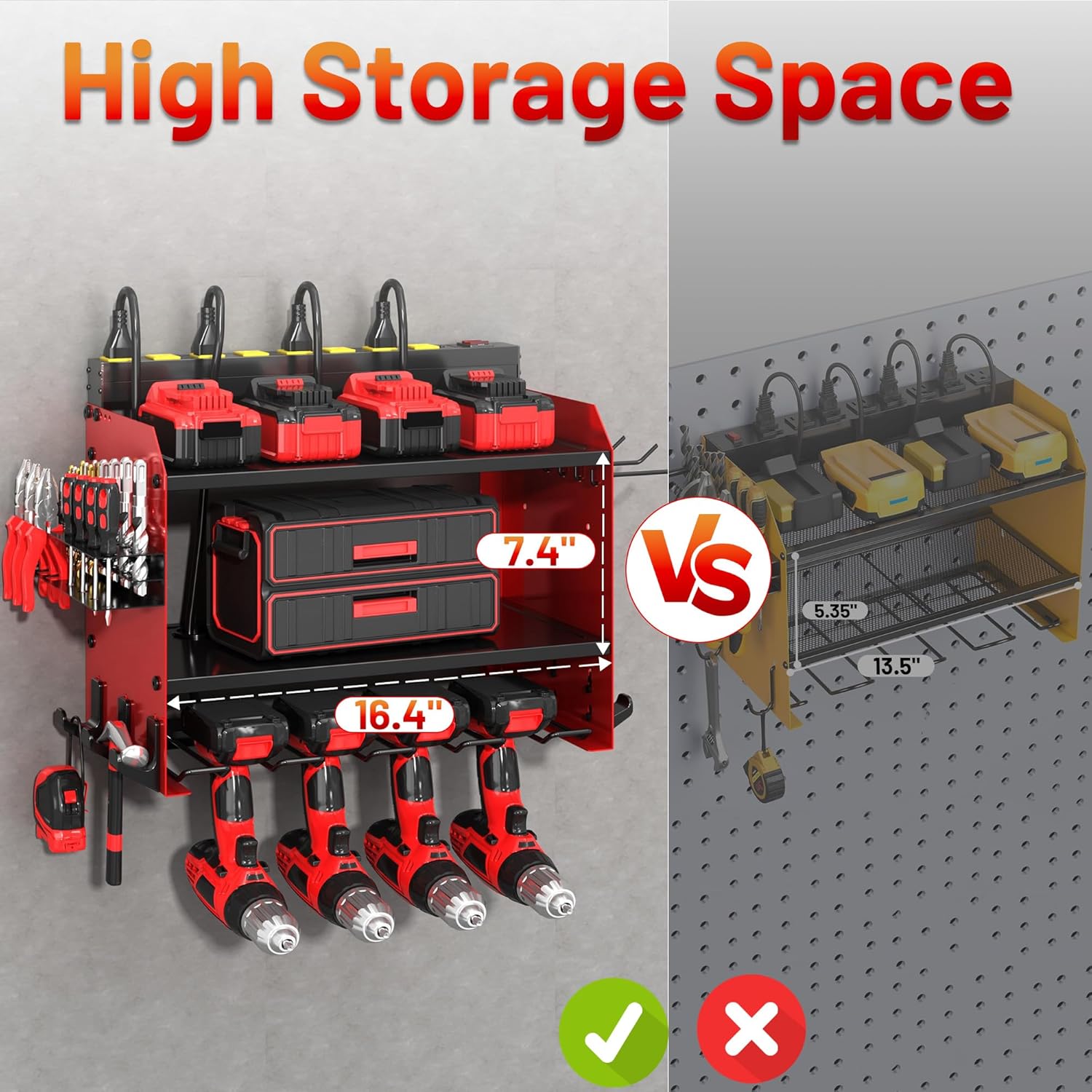 - WALL TOOL ORGANIZER:Power tool organizer wall mount utilizes free wall space to store tools,comes with charging station,4 drill holder slots and 9 hooks o keep your rechargeable tools in order,providing you with a clean and efficient workstation