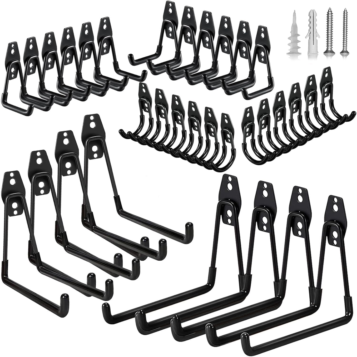 - 【Various Sizes to Fit All Needs】This garage hooks heavy duty set includes 32 wall hooks for hanging in four different sizes. From large square hooks to small J hooks, there are bike hooks for every item. Plus, we provide all the necessary hardware for easy installation.