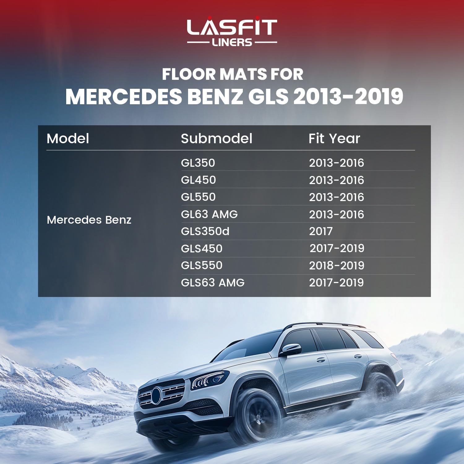 - Custom Fit : State-of-the-art 3D laser scanning technology ensures the perfect custom fit for Mercedes Benz GLS450 / GLS550 / GLS350d / GLS63 AMG 2019 2018 2017 & GL350 / GL450 / GL550 / GL63 AMG 2016 2015 2014 2013 with full coverage. LASFIT floor mats are precisely tailored for vehicle-specific floor carpets. Includes the backrest and cargo mats.