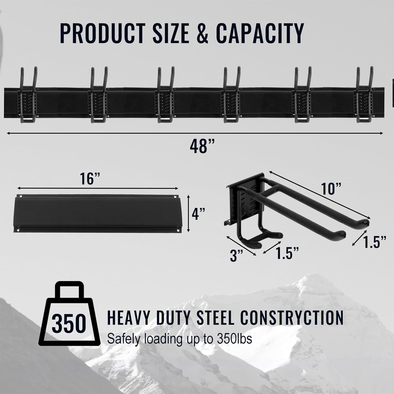 - MULTI-FUNCTION STORAGE RACK: Perfect wall mount garage tool organizer storage system, superb organization for garden tools, brooms , hoses , Yard Tools , pole cutters , hockey sticks , ski gears and more.