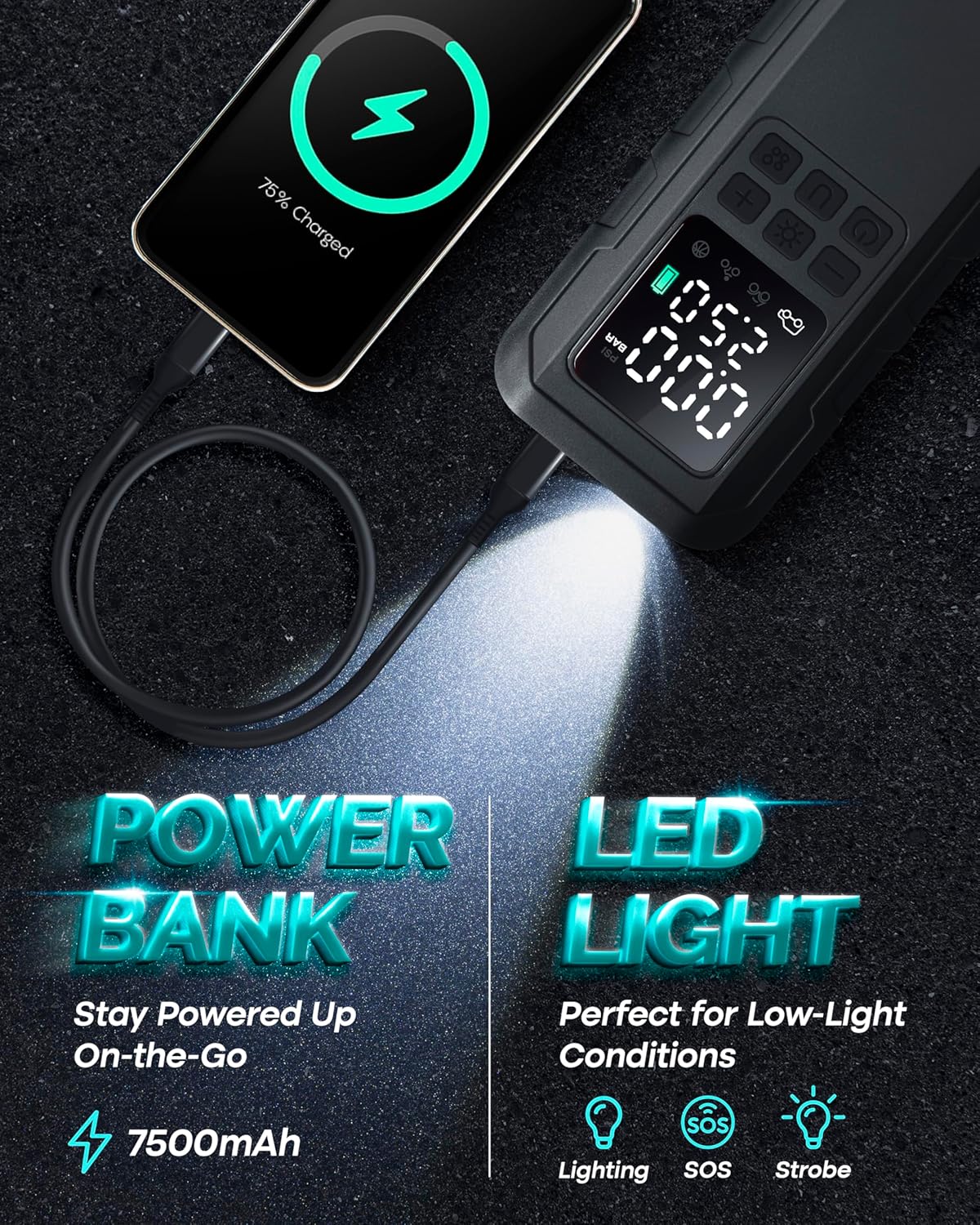 - LCD DISPLAY and LED LIGHT - The LCD display on the car tire pump shows the live pressure, unit display, preset pressure, battery level and mode display. Plus, the LED light on the top of the car air pump can act as a flashlight on a dark night or in an emergency.