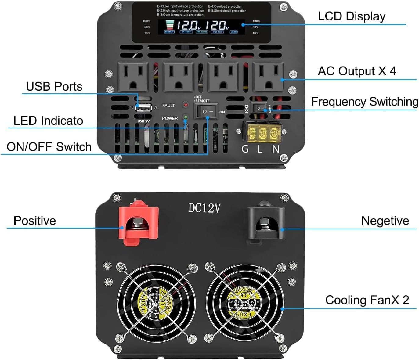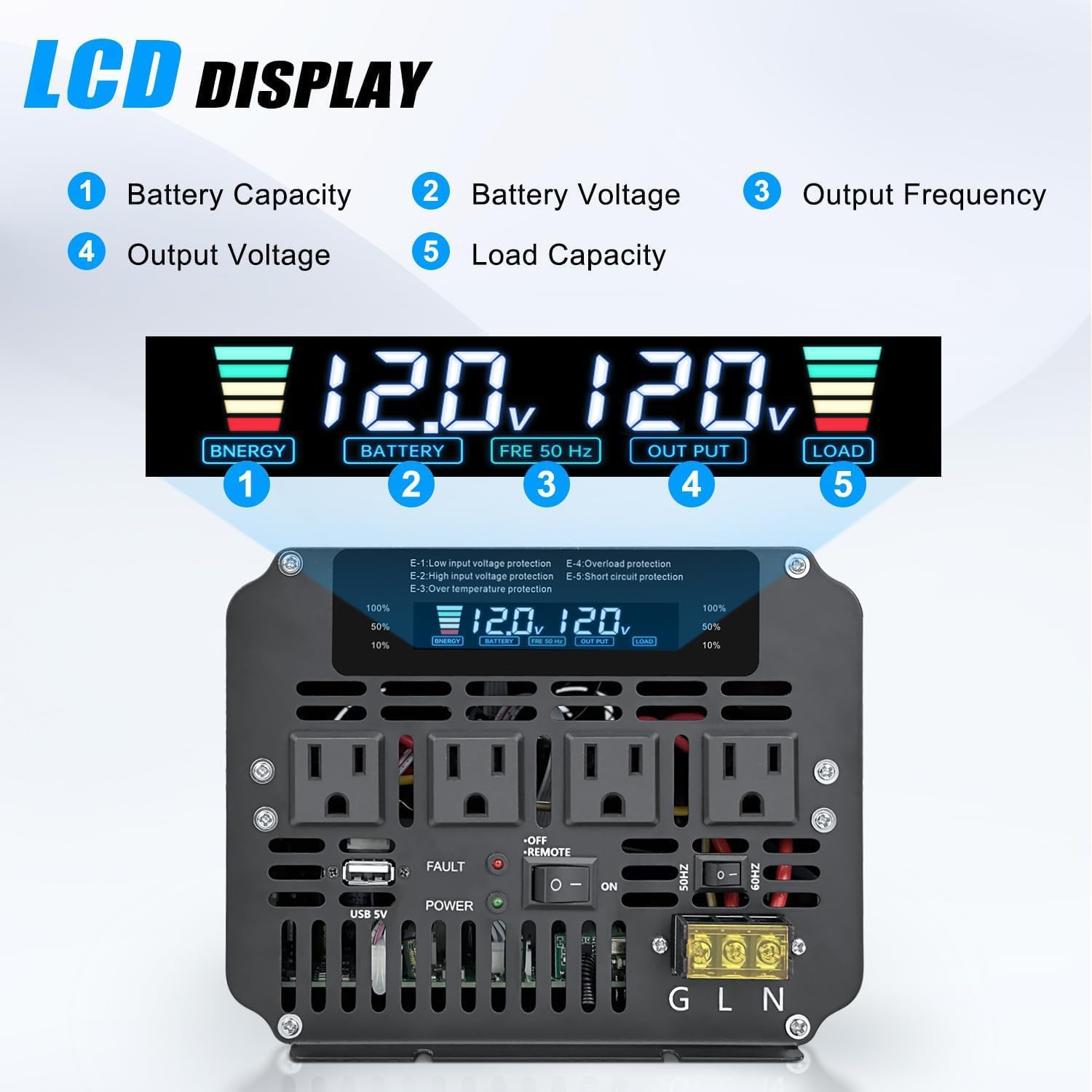 - Intelligent LCD Display: Clear LCD screen displays battery voltage, output voltage, remaining battery capacity, inverter load percentage, error codes, and more.