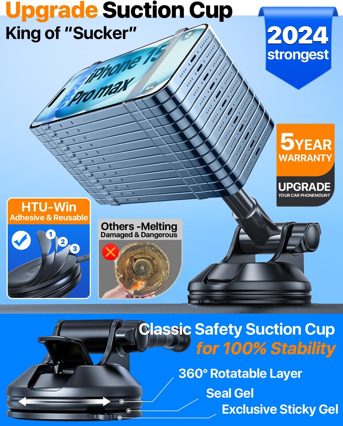 - [Original 4 Industry-leading Technologies for Top Safety - Thanks to Millions of Users' Voice] 1) Extreme 80LBS sticky suction force. 2) Reusable suction cup when removed and leave no trace. 3) Extreme 10,000 times vibration resistance. 4) Extra support stabilizer enforces the stability