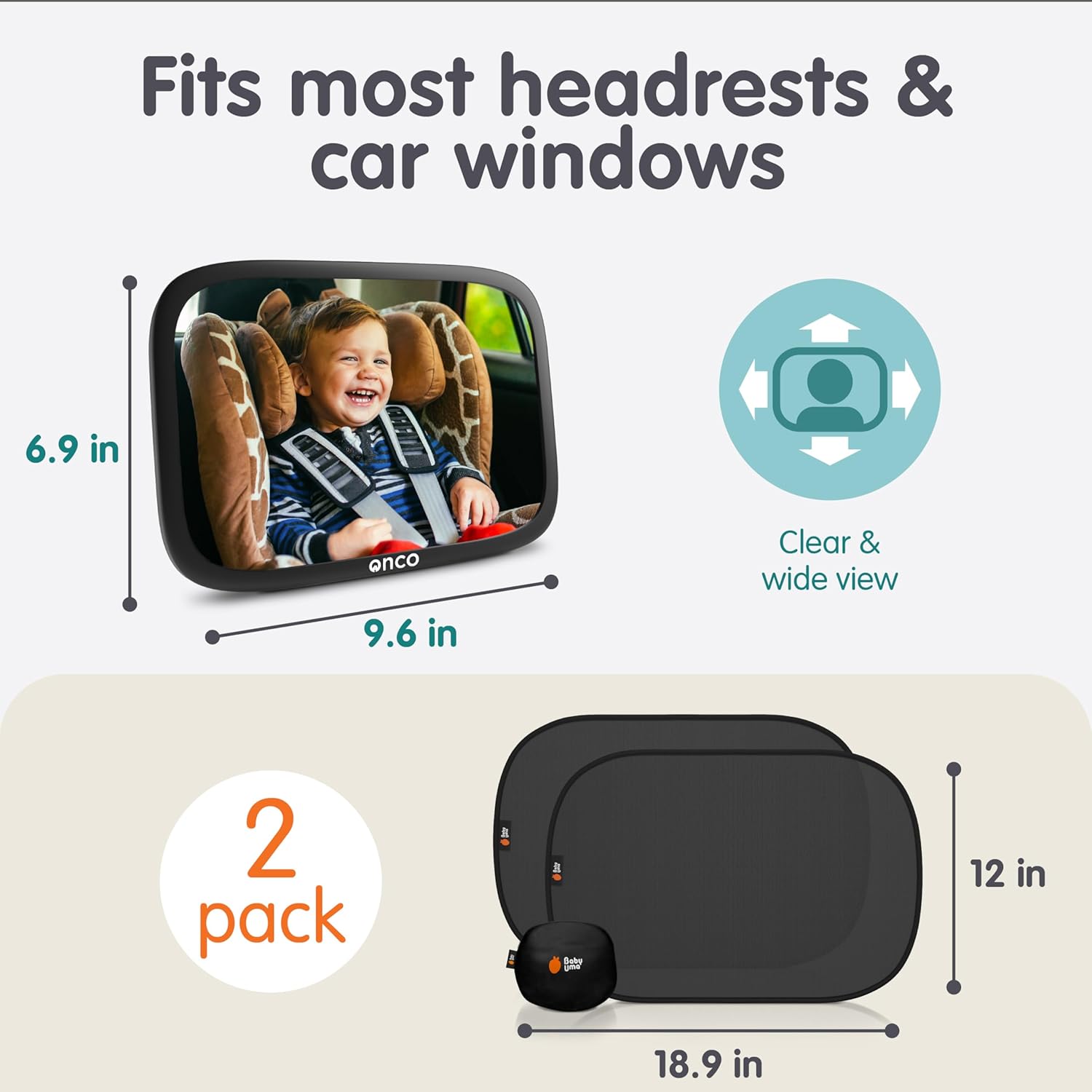 Onco Baby Car Mirror & Car Window Shades Bundle (18.9″ × 12″) - UPF 50+ Window Shade, 100% Shatter-Proof Car Mirror for Baby, Universal Shades & Mirror