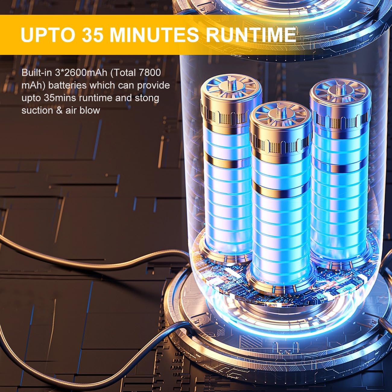 - [Rechargeable & 35mins Runtime] This handheld car vacuum cleaner is equipped with total 7800mAh high-capacity battery and can be quickly charged about 3hours with type-C cable.Running time: Low speed [P1] -35 minutes, high speed [P4] -20 minutes.