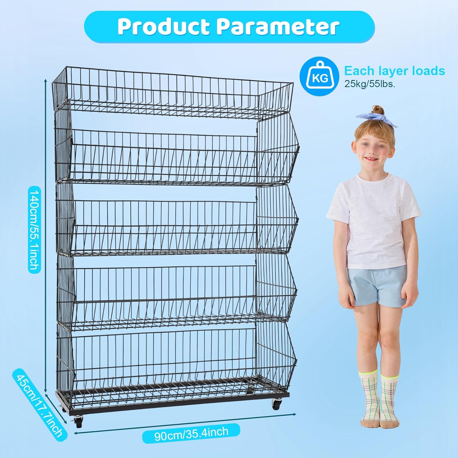 - Storage Assistant: This 5 tier fruit wire basket stand has a 5-tier design which provide sufficient space to store fruits, vegetables, toys, books, snacks(all are not included), etc., placing your sale items in an orderly manner to attract customers
