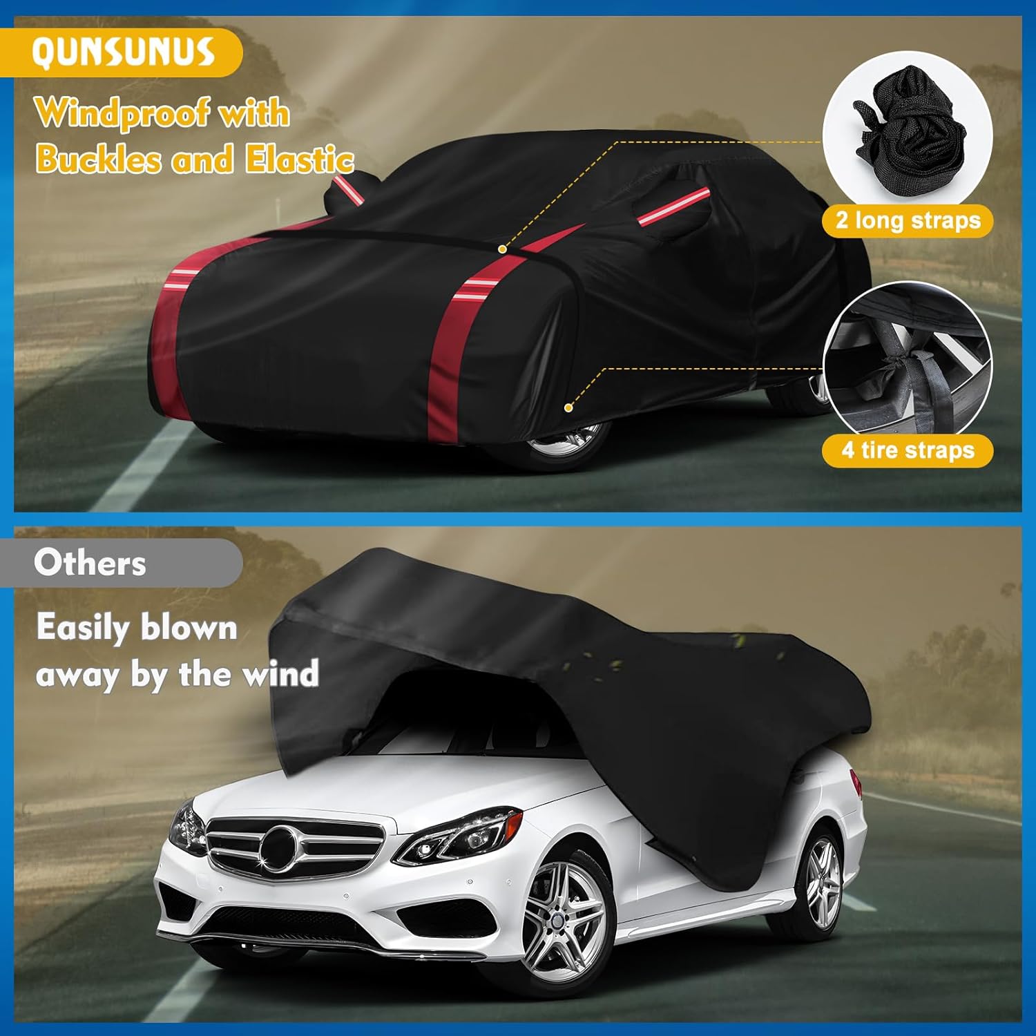 - ăWindproof Design-Stay in Placeă*1. Four straps used on the four wheels to make sure the cover stay in the place. *2. A windproof buckle pass through the middle of the car. *3. Elastic Strap at the bottom of front and rear to ensure cover fit your car and to protect your car cover from blowing off, even in heavy wind.
