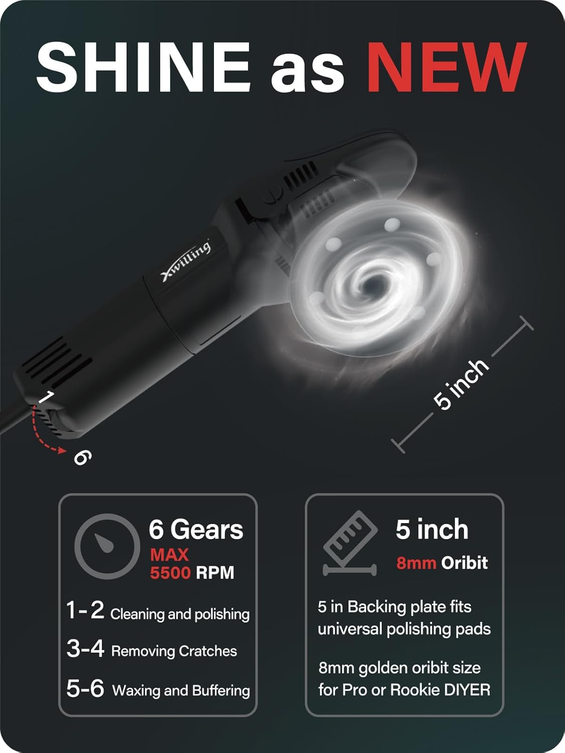- 6 Variable Speed Control: XWILLING dual action polishing machine can generate speeds of 1800-5500 RPM by adjusting the speed dial, and realize fast switching between waxing and polishing projects to improve work efficiency
