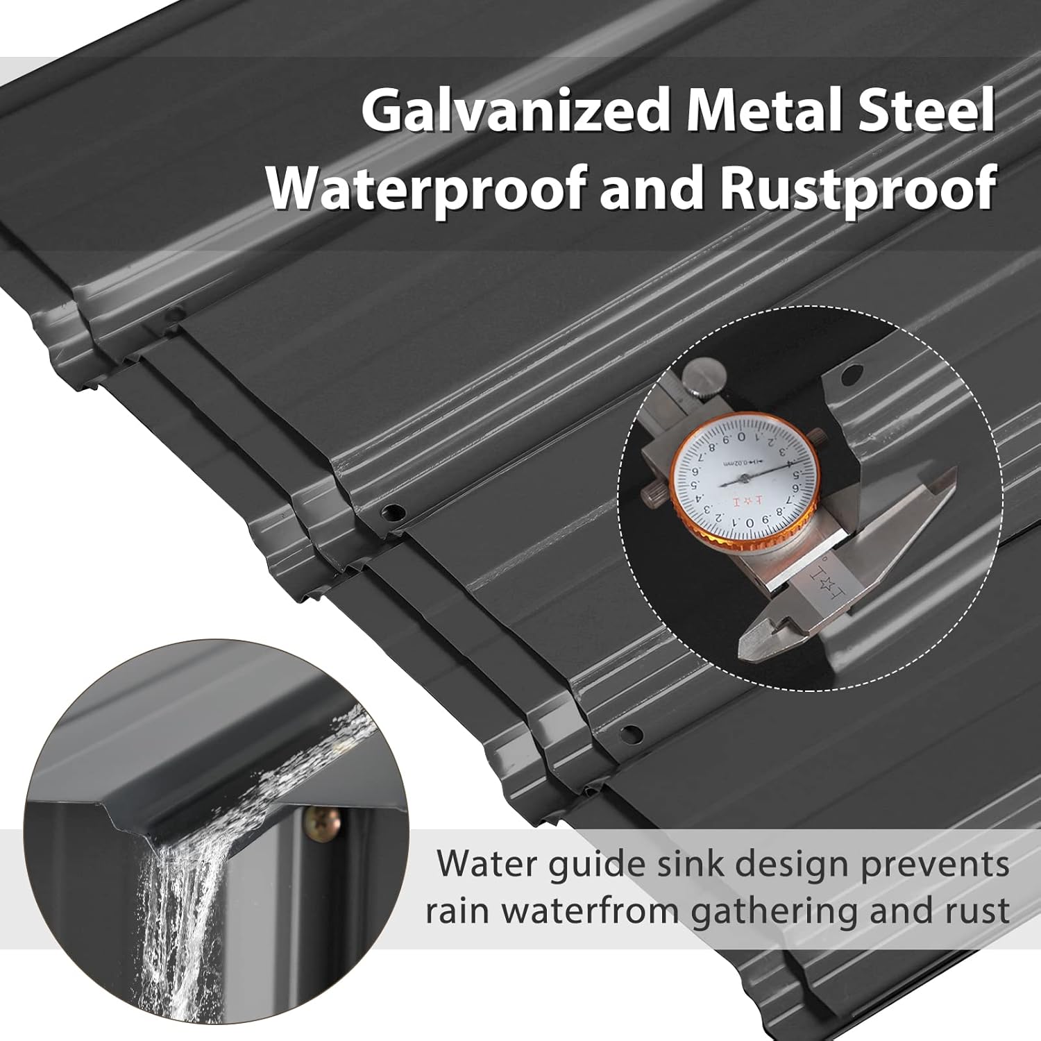 - 🏡【High-Quality Material 】-Our outdoor tool shed is constructed with thicker galvanized steel panels, making it weather-resistant, waterproof, and UV-protected. The lock for additional security to your stored items / Smooth plastic protective shell for screw and roof panel corner to avoid injury / Each piece panel is tightly connected and will not leak rain / Durable hinge and steel-reinforced door. This outdoor storage house is the best shed for storage, better and safer.