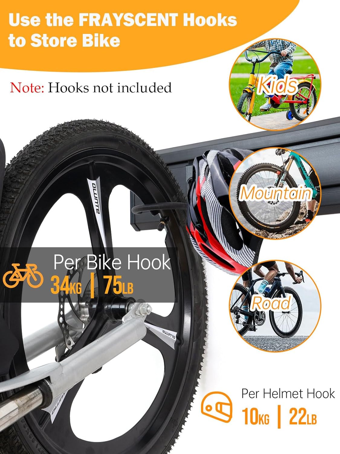 - [COULD WORK WITH BIKE HOOKS FOR GARAGE] Garage bike rack wall mount get your bikes off the floor and make it easy to organize and clean your garage. Notice: not include SLAT WALL HOOKS. Suitable for mountain bikes, road bikes, folding bikes, hybrid bikes, adult bikes, and kids bikes, etc. Make bike storage effortless with our wide size hooks that allow for easy hanging and taking down of your bike.