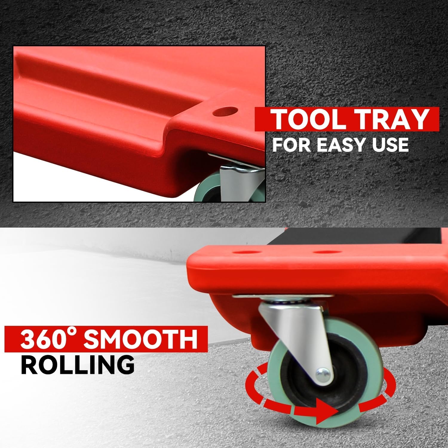 - 360 Degree Swivel Casters: Our rolling creeper is equipped with six multi-terrain swivel casters, which are industrial strength and designed to resist oil, chemicals, and grease. It provides extra maneuverability with a caster size of 3 inches.