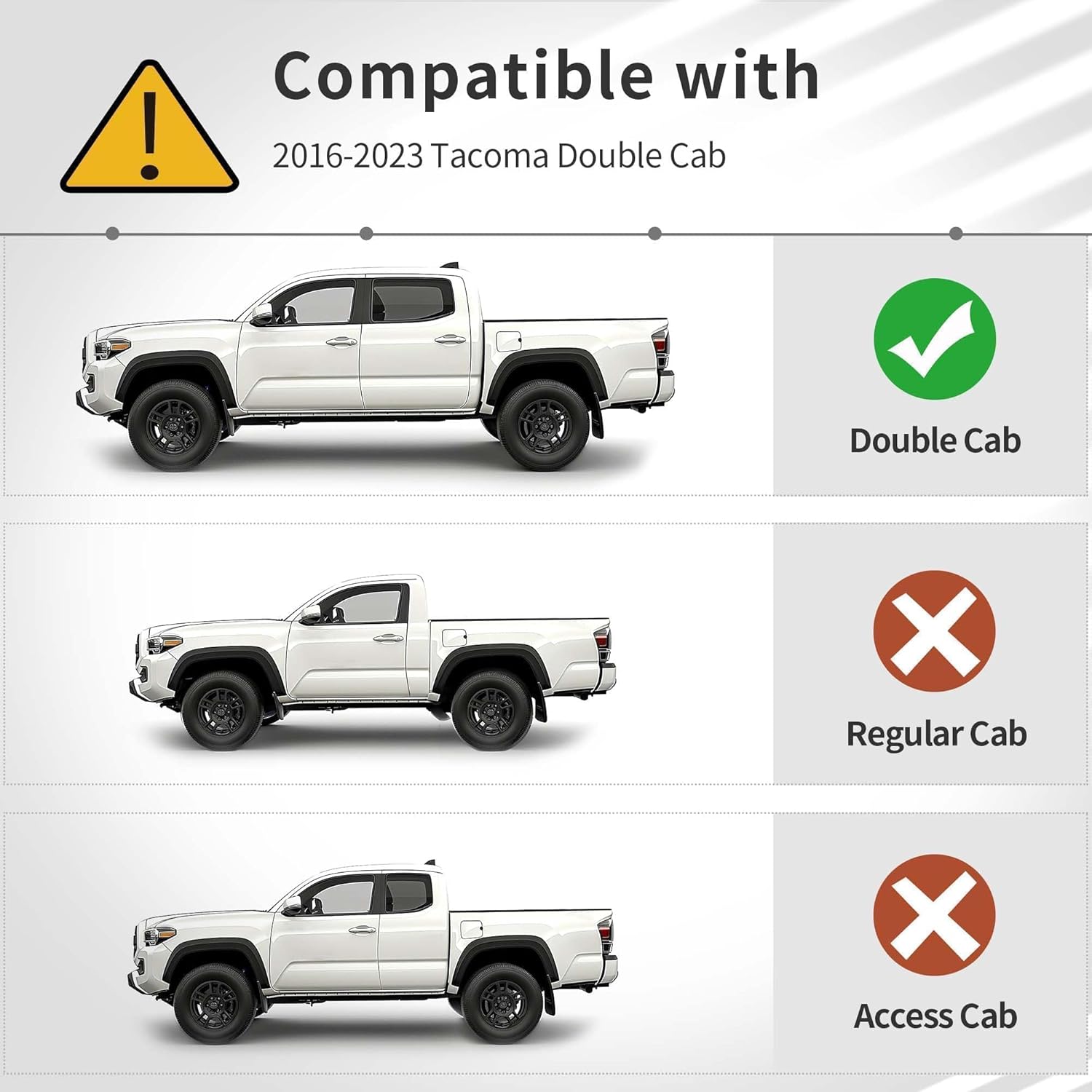 - Material Thermoplastic Elastomer (TPE) : Vehicle Service Type Toyota Tacoma 2016-2023 (Only for Double Cab & Automatic) Toyota Tacoma 2016-2023 (Only for Double Cab & Automatic) See more