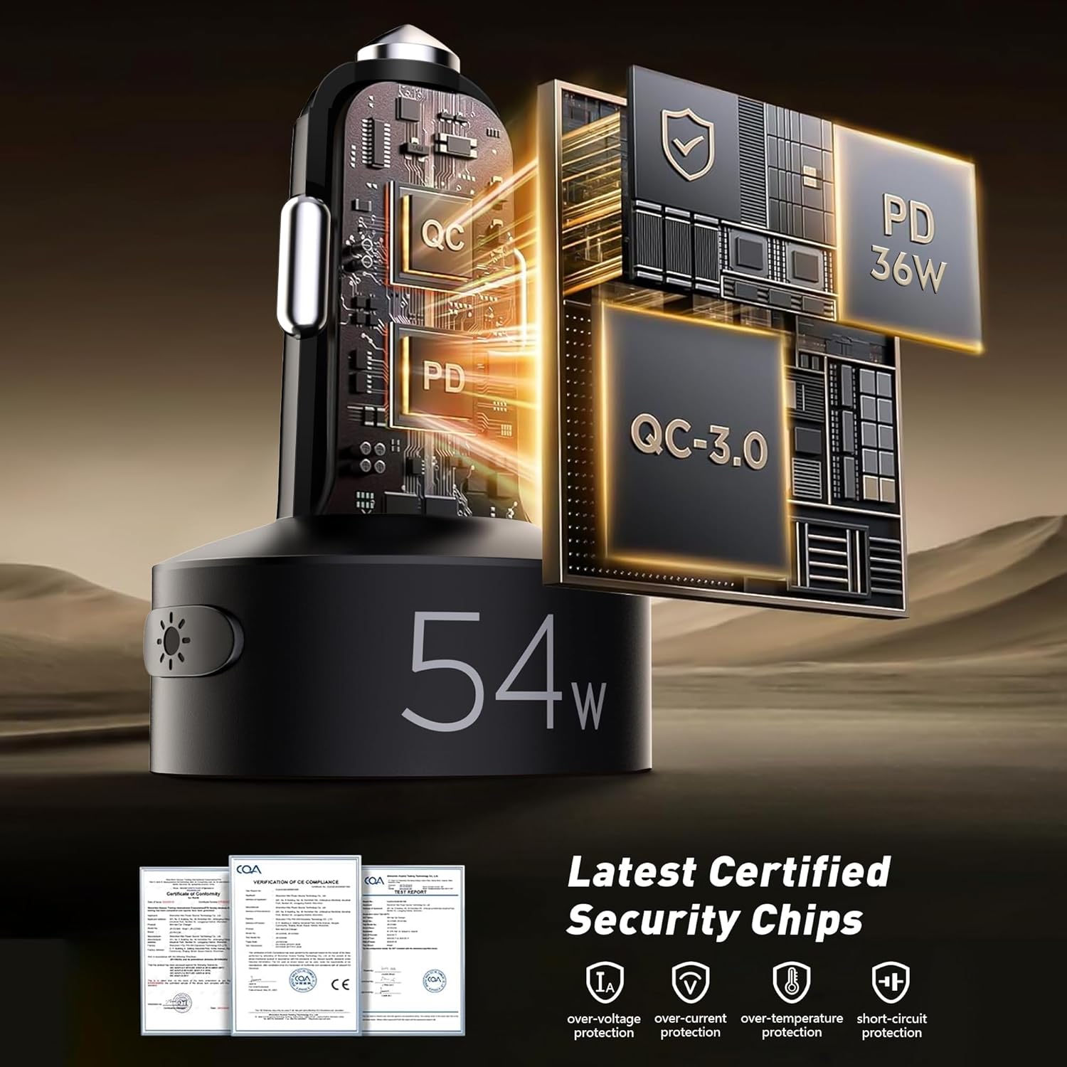 FM Transmitter Bluetooth 5.3, 54W Fast USB Car Charger [PD 36W& QC3.0 18W] Cigarette Lighter Wireless Radio Adapter Supports Hands-Free Call, Aux 3.5mm, 9 Colors LED Backlit