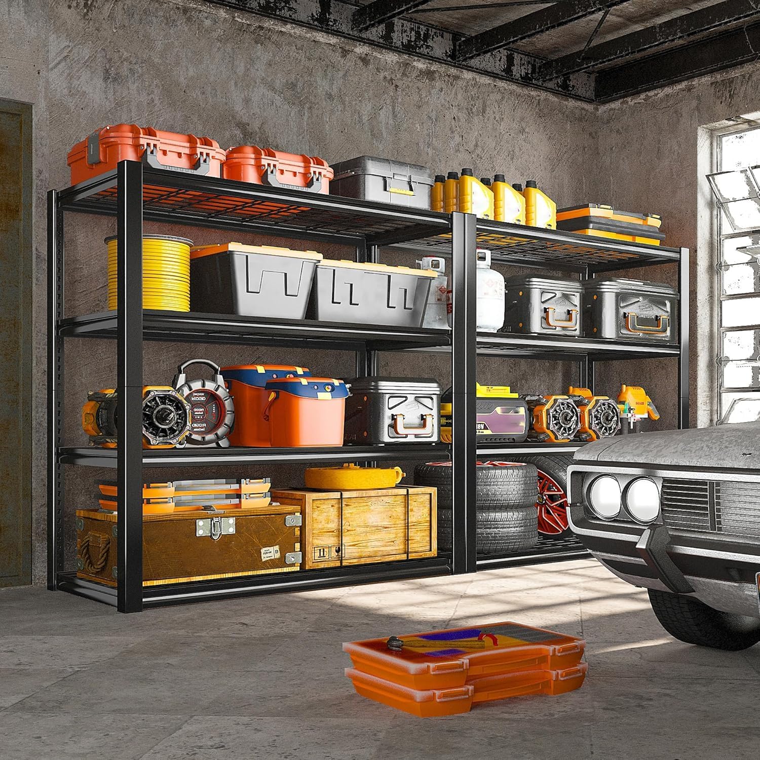 - 【2200LBS Capacity Garage Shelving Heavy Duty】Made of heavy duty metal, this 4-tier storage shelves holds 550 lbs each tier and 2200 lbs in total, perfect for loading heavy items like tires, garage gears, cans, jars and etc. Differ from wood boards, shelves from REIBII garage storage shelving will not break or fall apart, with no chemical material used, this metal shelving stay durable and sturdy as well