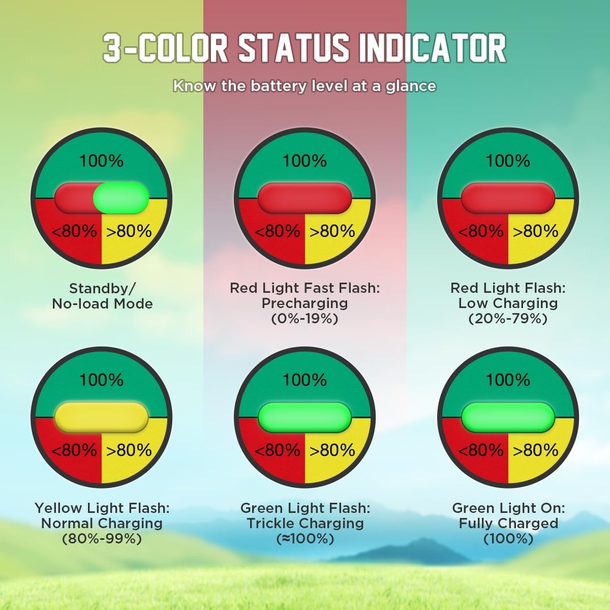 - 【3-Color Status Indicator】The 36 volt ezgo golf cart charger has a 3-color indicator light that help you to know the battery level at a glance. 1) Red Light Fast Flash: Precharging(<20%); 2) Red Light Flash: Constant current charging (20%~80%); 3) Yellow Light Flash: Constant-voltage limitary-current charging (>80%); 4) Green Light Flash: Trickle charging(≈100%); 5) Green Light is Always On: Fully charged (100%).