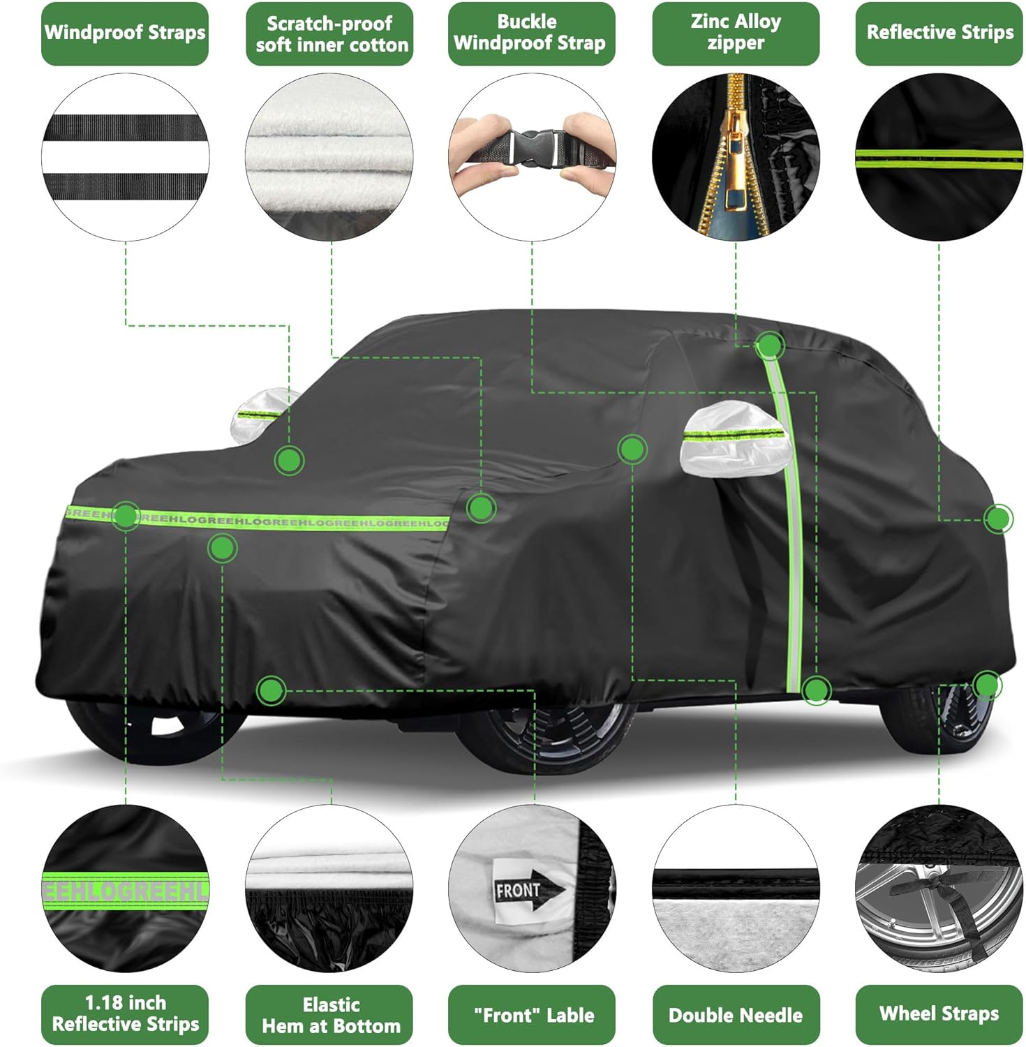 - All Weather Protection - car covers made of 210T silver high-density polyester taffeta are perfect for indoor and outdoor use, no matter the sun or the cold weather, protect your car from UV rays, snow, rain, frost, sand, dust, leaves, branches, and bird dropping. Highly reflective anti-UV coating can keep the car cool even on sunny days. The thicker cotton effectively prevents scratches and dust accumulation.