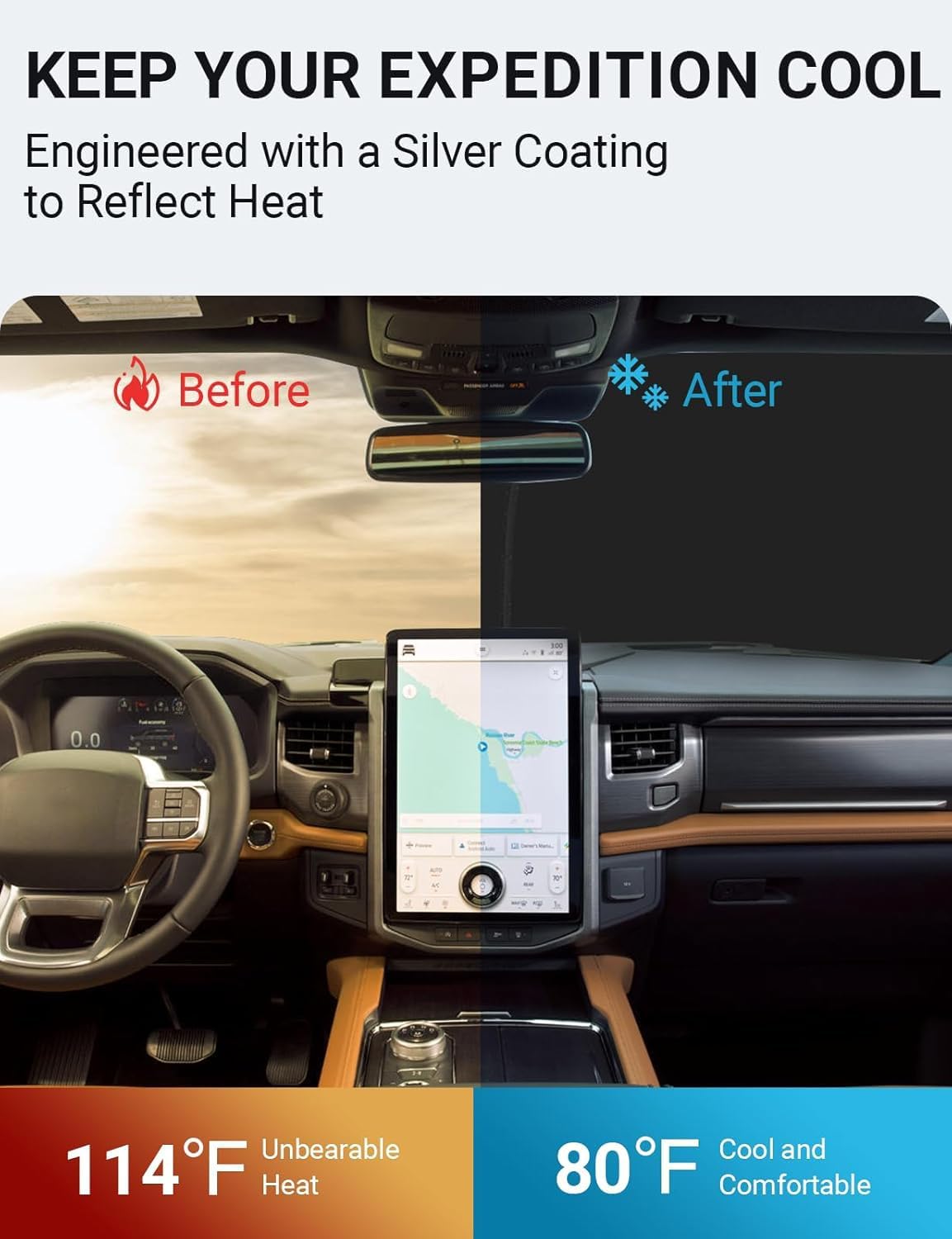 - Certified Sustainable. DESIGNED IN USA!!! Custom Design: The front windshield shade has been custom cut specifically for Ford Expedition. Precise fit design and Reinforced steel rings make a precise and secure fit to the window, no need to use suction cups to hold it in place. It won't sag or collapse like other car heat shields. Fits for Ford Expedition 2025 2024 2023 2022 2021 2020 2019 2018.
