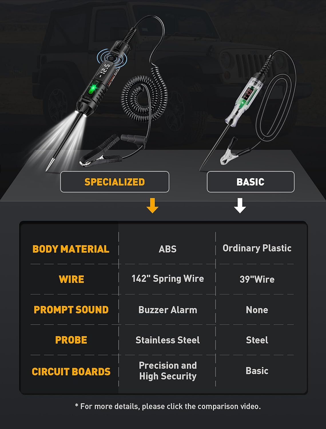 - 【ENHANCED SPRING WIRE & ANTI-LOSS PROBE COVER】The automotive light tester's high-quality thickened anti-freeze spring wire extends 142", enhancing portability, convenience, and speed for maintenance and diagnostics. The sharp stainless steel probe pierces insulation easily, accessing tight spaces. The loss-proof cover prevents punctures and ensures convenient storage.