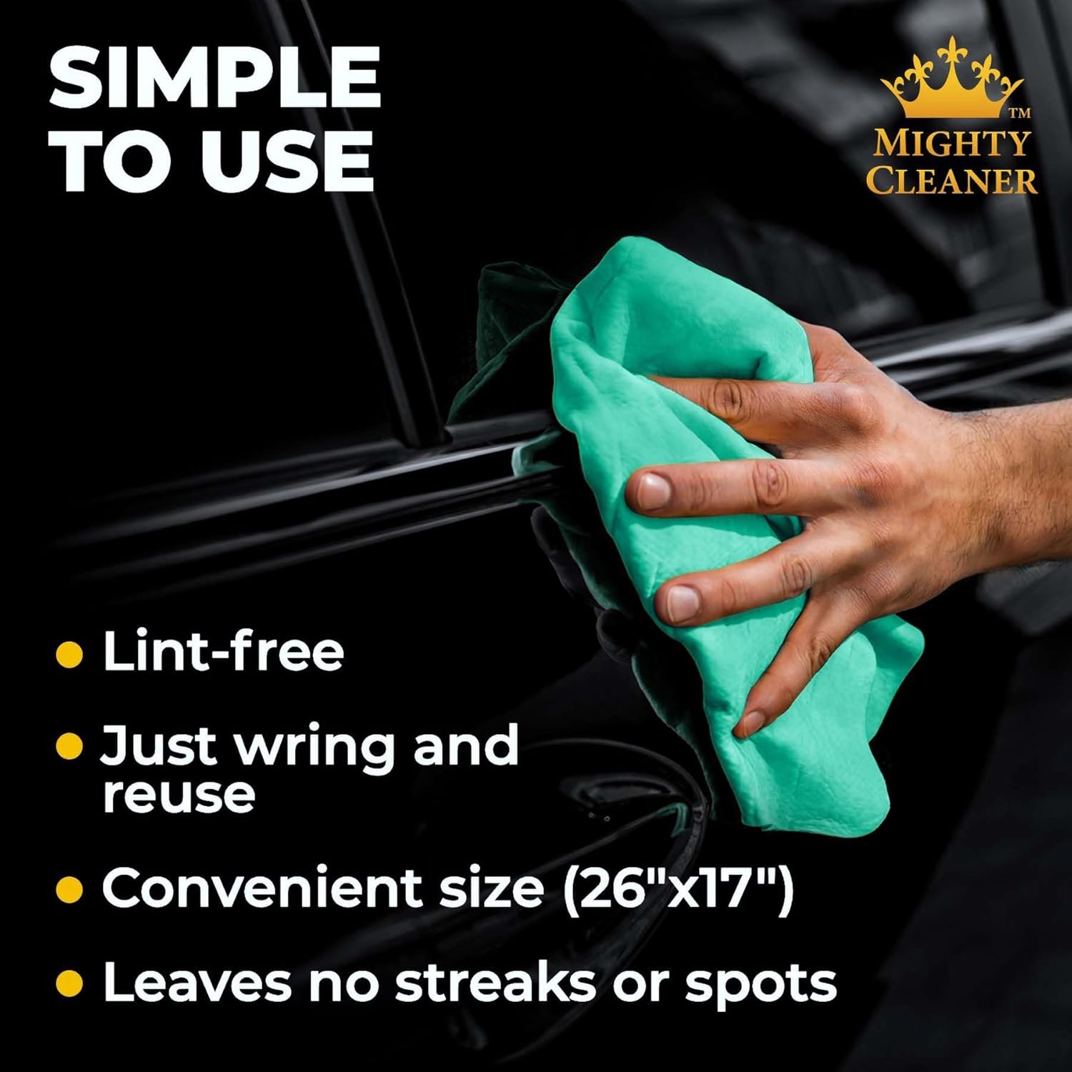 - EXCELLENT ABSORBENCY - The Mighty Cleaner chamois towel for car care quickly absorbs and holds large amounts of water, leaving your car’s finish spotless and streak-free. Our shammy cloth for car drying works like a sponge and a towel in one for cleaning occasional spills.