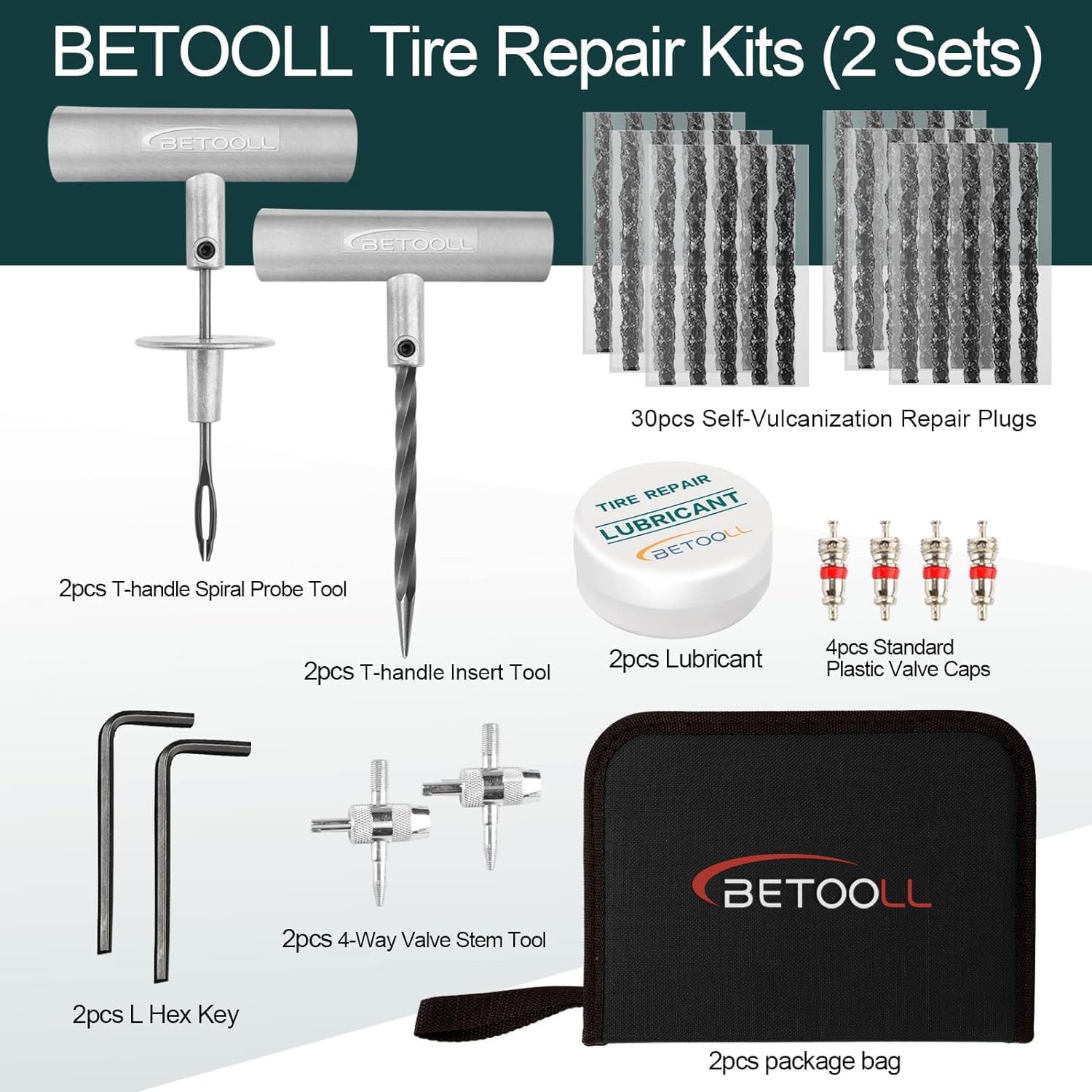 - 2sets 24pcs Tire Repair kits: Includes 1pc T-handle insert tool & 1pc T-handle spiral probe tool; 1pc 4-way valve stem tool; 2pcs Plastic Valve Caps; 15pcs self-vulcanization repair plugs; 1pc jar of lubricant; 1pc Instructions for use steps; 1pc “L” hex key; 1pc package bag.
