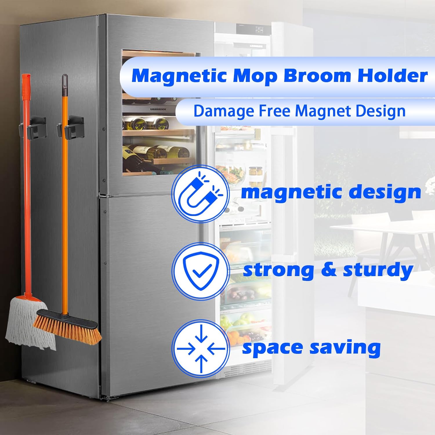 - 【No Damage Magnetic Mop Hanger】 The magnetic broom holder is user-friendly, requiring no drilling or screws, and can be easily relocated. Easily customize your space and place your cleaning tools where you want them