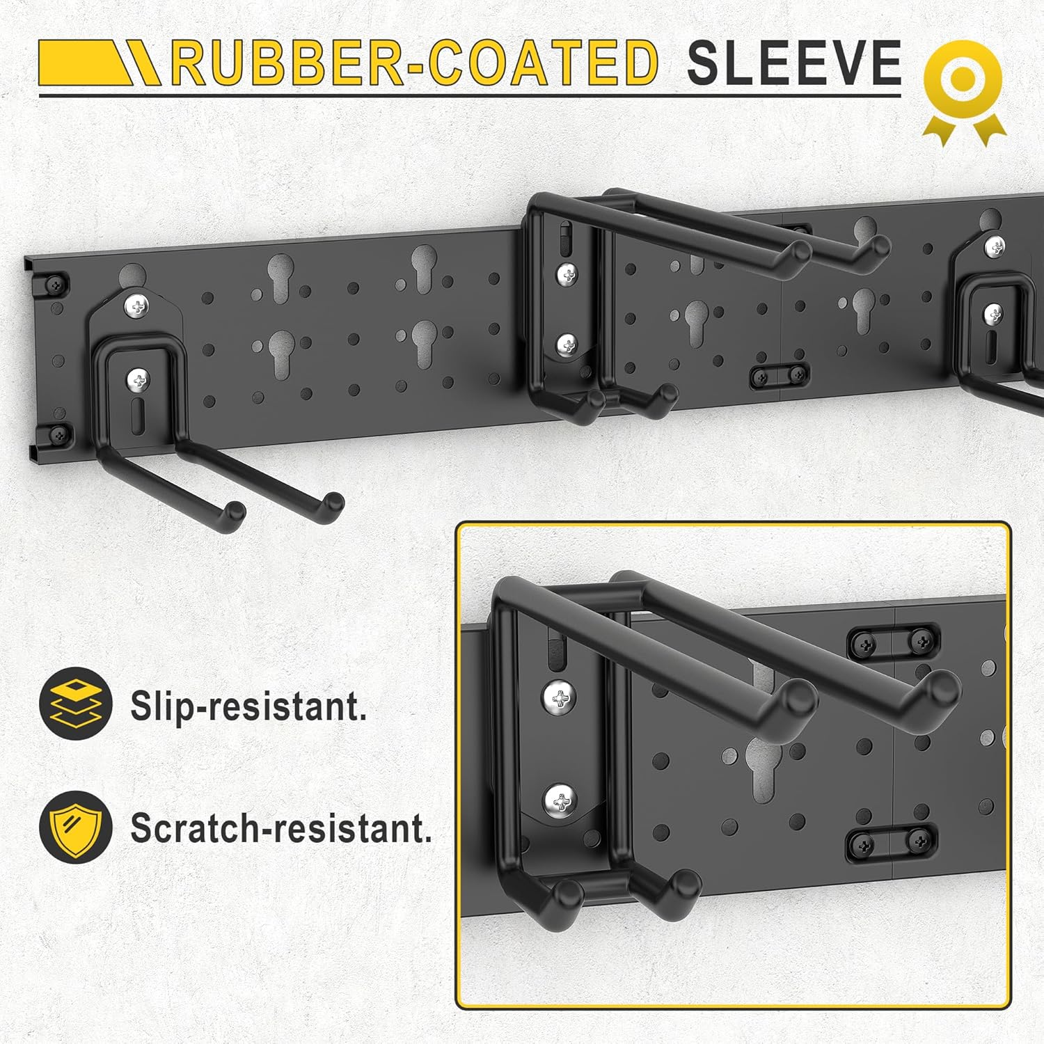 - Ultra-Durable Construction—The garage storage rack is crafted from powder-coated steel -resists of rusting, chipping and cracking for years of wear and tear. The rubber coated sleeve prevents the tool from scratching or sliding. Holds up to 330lbs.