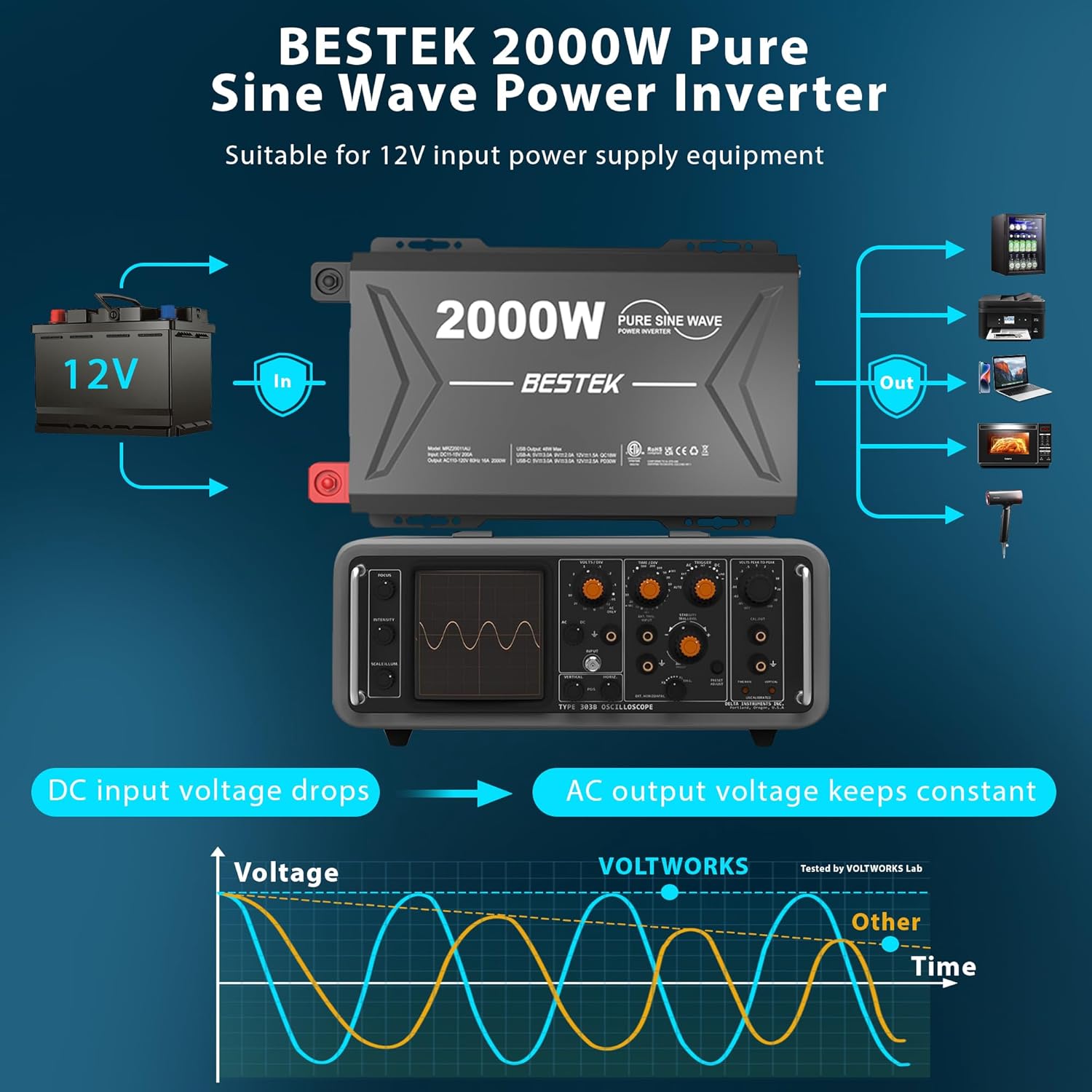 - BESTEK 2000W Pure Sine Wave Car Inverter:Power inverter 12V DC to 110V/120V AC with 4000W peak power,Its output waveform is same as the AC power waveform of mains power grid which delivers a smoothly-varying sine wave for sensitive electronics provided by the electric utility.Perfects for off-grid system,Lower THD,Less wear,Strong inductive Loads Capability.It has little interference with radios, communication and precision equipment.It ensures seamless and smooth operation of your devices.It's also recommended by most cordless tool manufacturer that a pure sine wave inverter is used to ensure long battery life