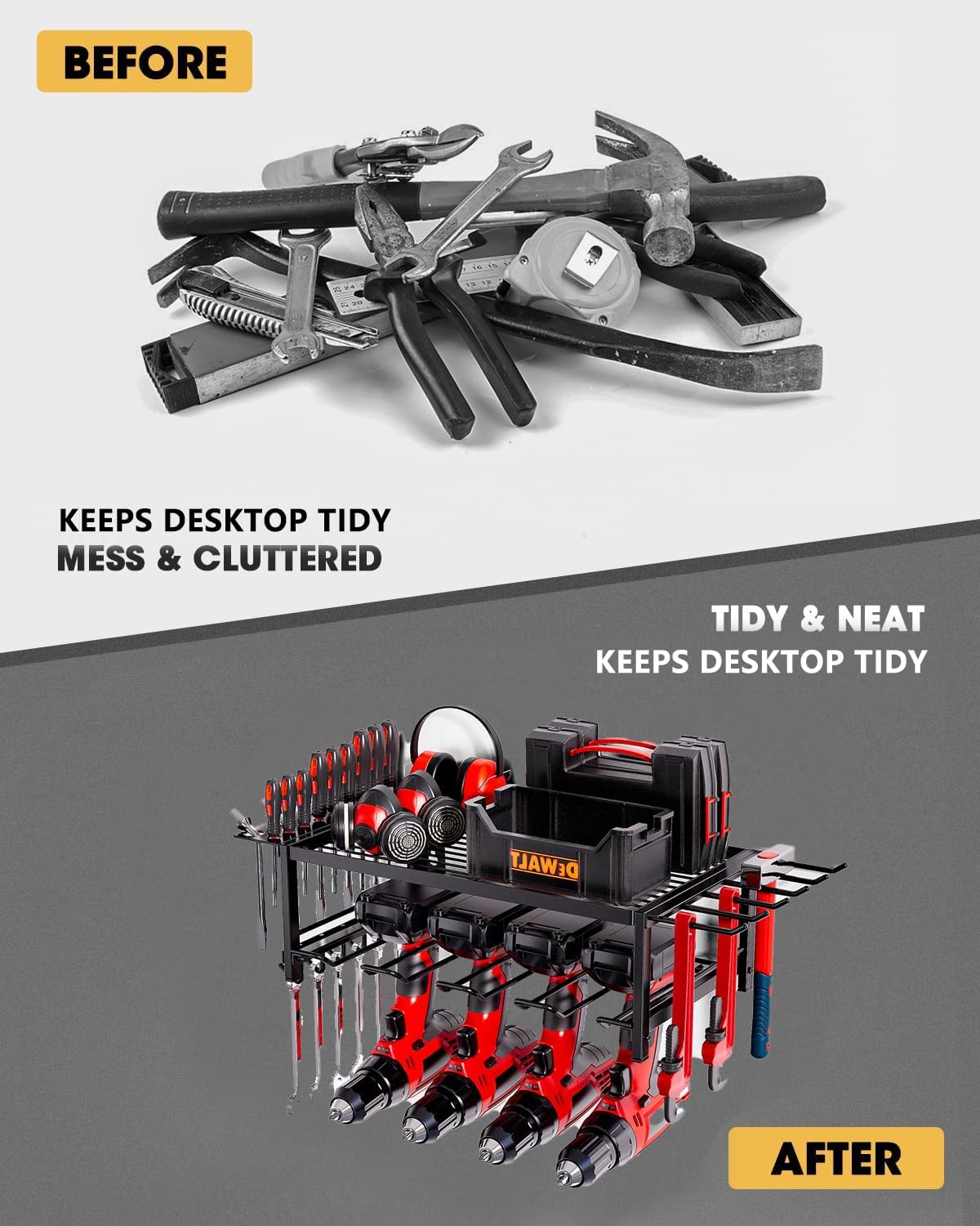 - Efficient Organization: Maximize garage space with this 2-tier wall-mounted tool rack designed to hold up to 4 power drills, keeping your workspace clutter-free. the upper two layers can store other heavy tools or various small tools, and a hammer holder, pliers holder and screwdriver holder are added to the side.