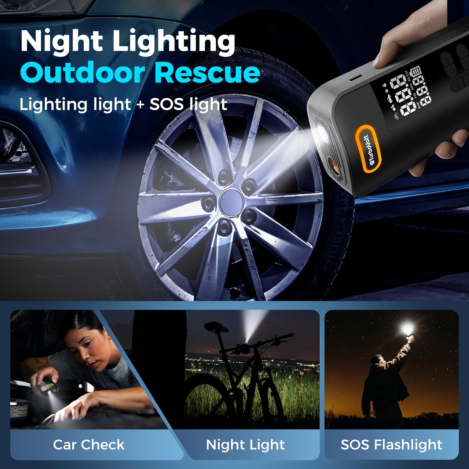 - 【Emergency light scouce】The small air compressor portable comes with a built-in flashlight featuring steady and flashing modes. The flashlight has 3 modes (flashlight, SOS, and strobe light) to light up the night for easy operation.Use digital tire pressure gauge with inflator to inspect car or bike parts in low light, as an emergency light during roadside situations, or as a strobe signal in outdoor settings. Inflator air pump acts as a reliable lighting whenever you need it.